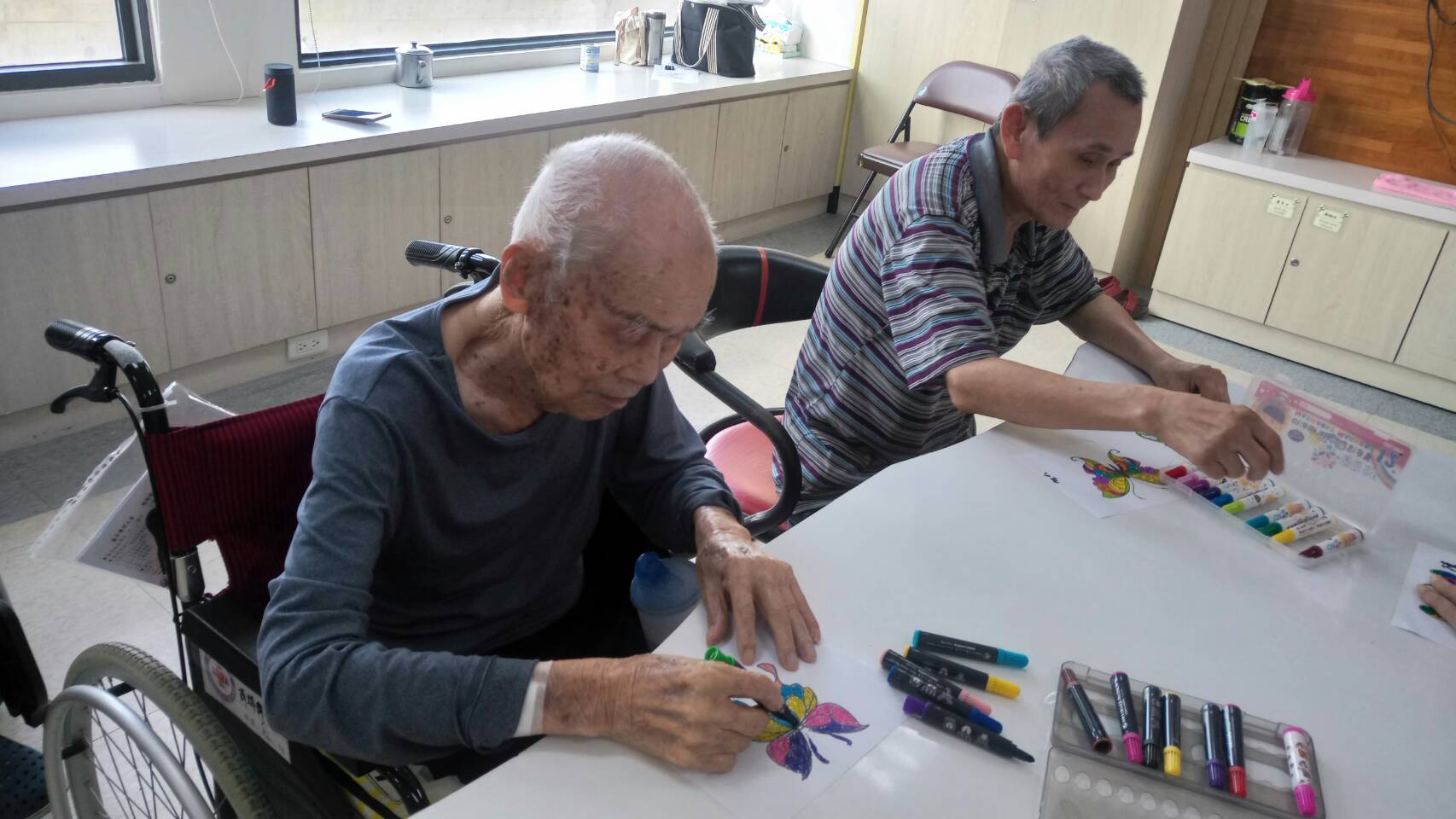 右手拿畫筆 左手扶著畫紙認真模樣真可愛 每個阿公阿嬤心中都有屬於的小蝴蝶 畫出獨特風格美麗的蝴蝶 #長照 2.…