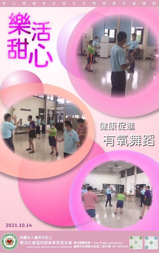 今日在有充滿節奏感的音樂下邊哼歌, 邊舞動著身體讓服務對象盡情揮散汗水並將快樂、愉悅的氛圍散播在整個據點