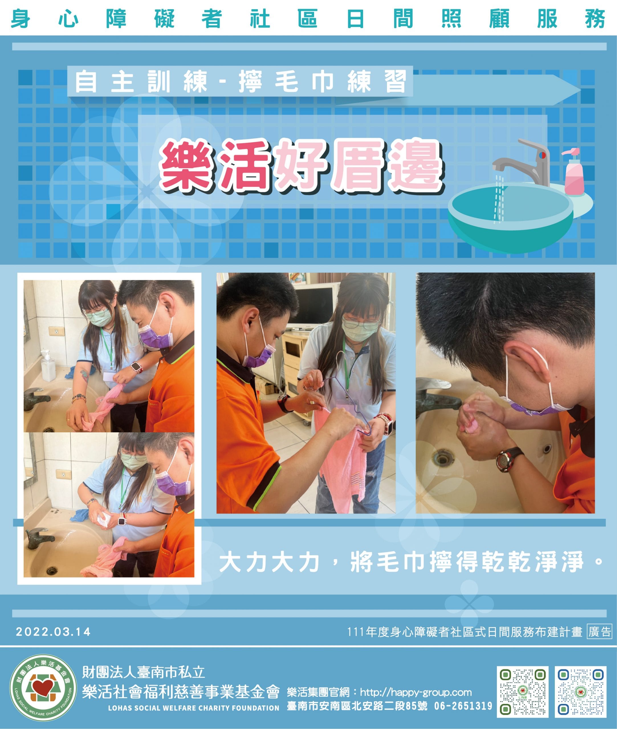 擰、擰、擰夥伴們在專業工作人員的引導中 一步一步確實的練習練習 手部的靈活力認知毛巾是否有髒汙、有沒有擰乾淨唷…