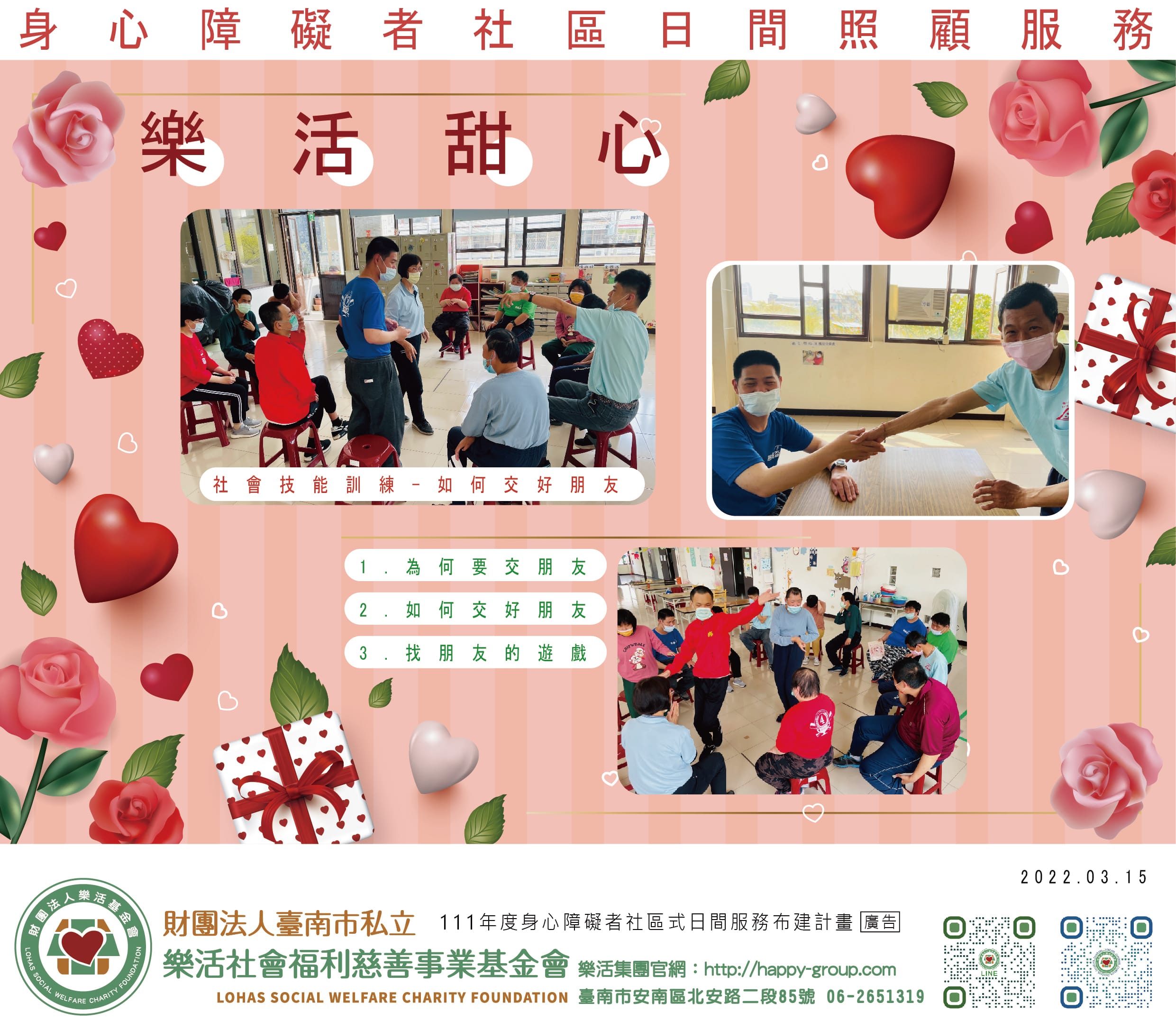 今天夥伴們在甜心學習社會認知訓練, 如何交到好朋友,大家的表現都相當的棒, 每個人都勇敢的向對方介紹自己,大家…