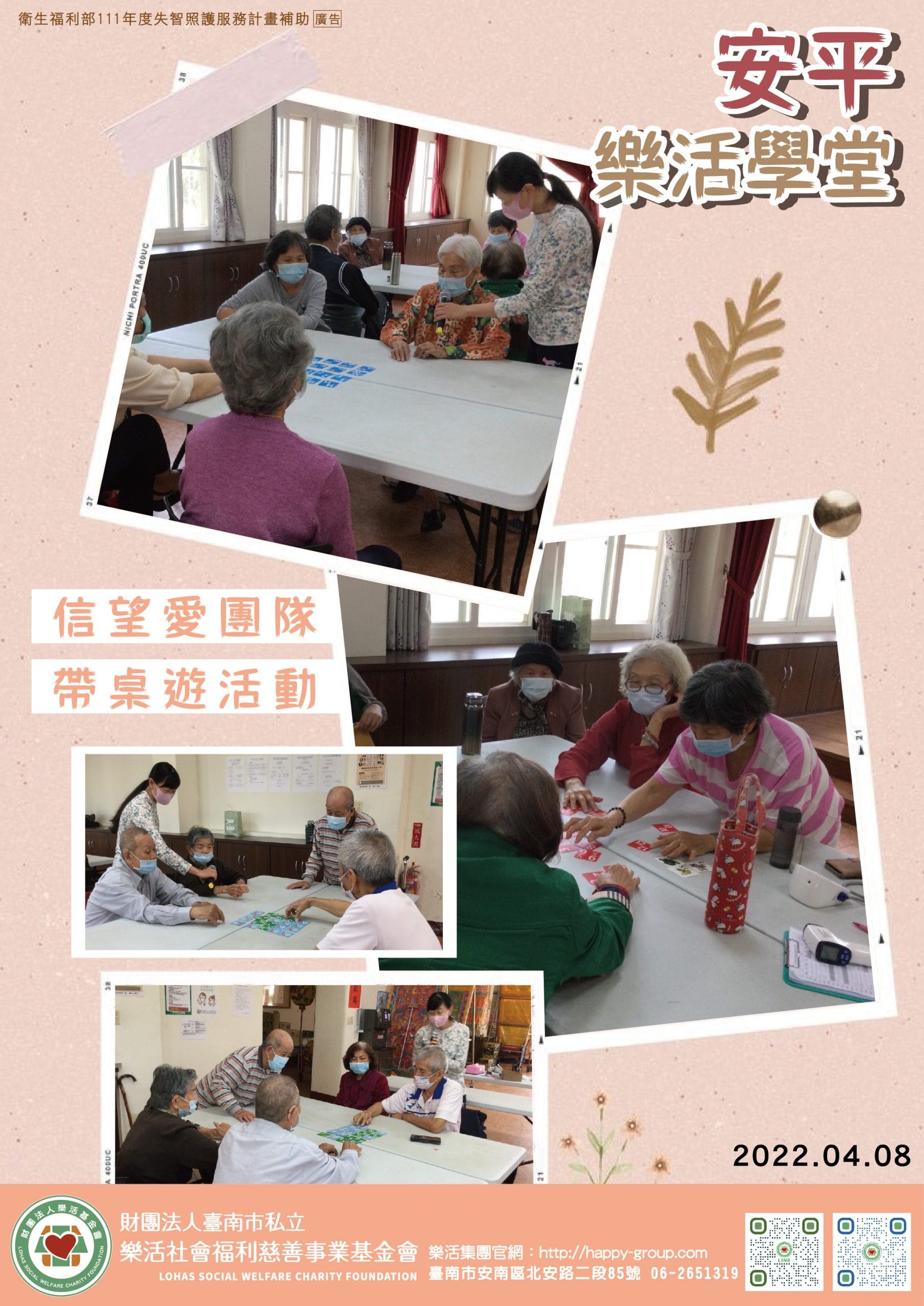 今天由信望愛團隊來帶桌遊 透由桌遊讓據點的長輩動動腦 學會分享 大家都玩得好開心喔期待下週的活動 安平失智據點…