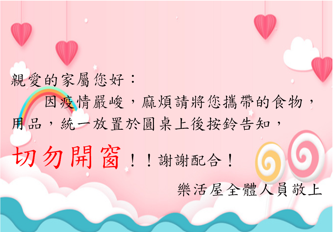 📢📢樂活廣播樂活廣播📢📢近日因疫情嚴峻,請各位家屬將攜帶來的物品放置於圓桌上後按鈴,謝謝各位的配合🙂🙂 樂活廣…