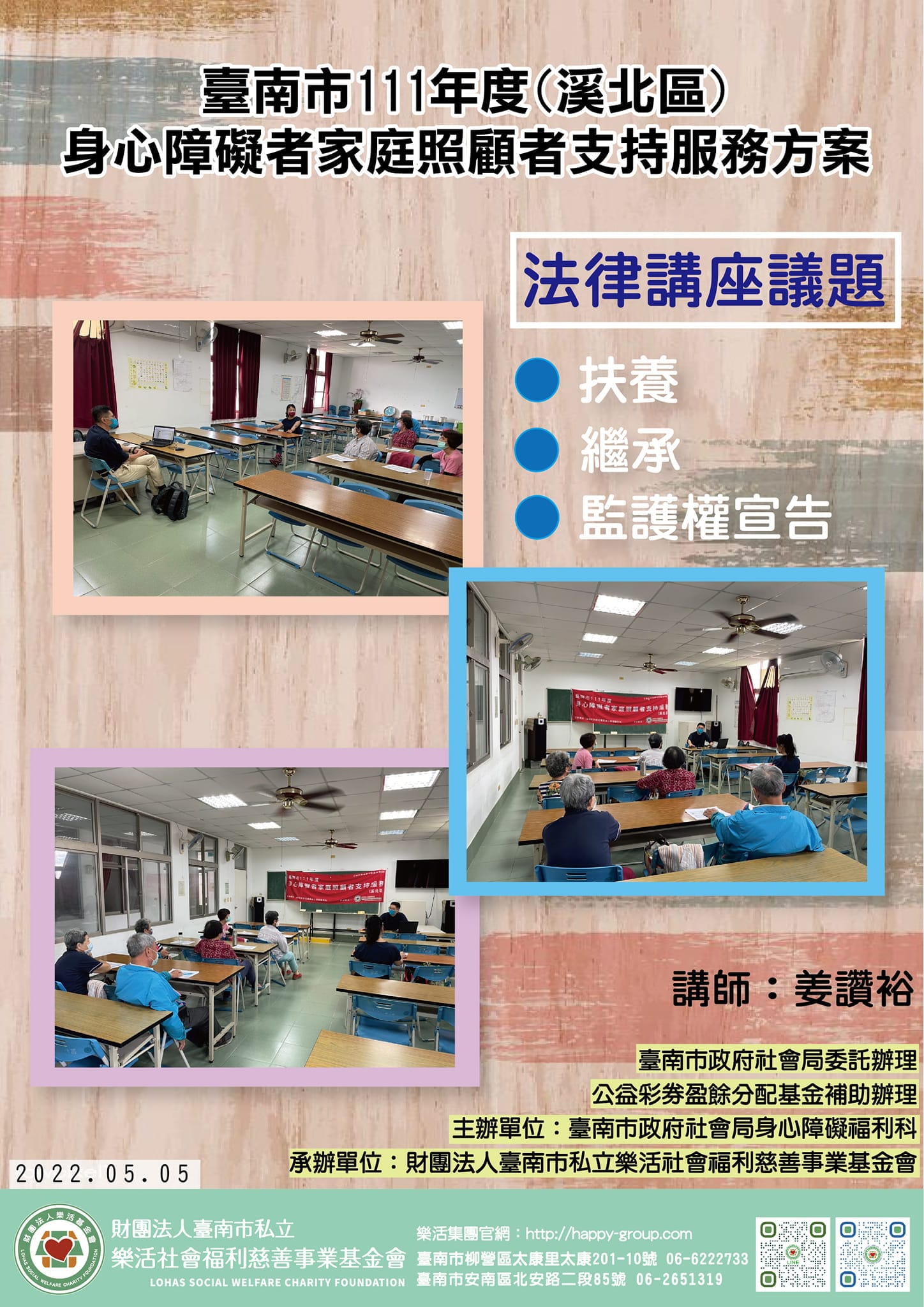 111年度身心障礙者家庭照顧者支持服務-溪北區 🎈💌法律講座議題💌法律專業談,法律百百種透過專業的姜讚裕律師讓…