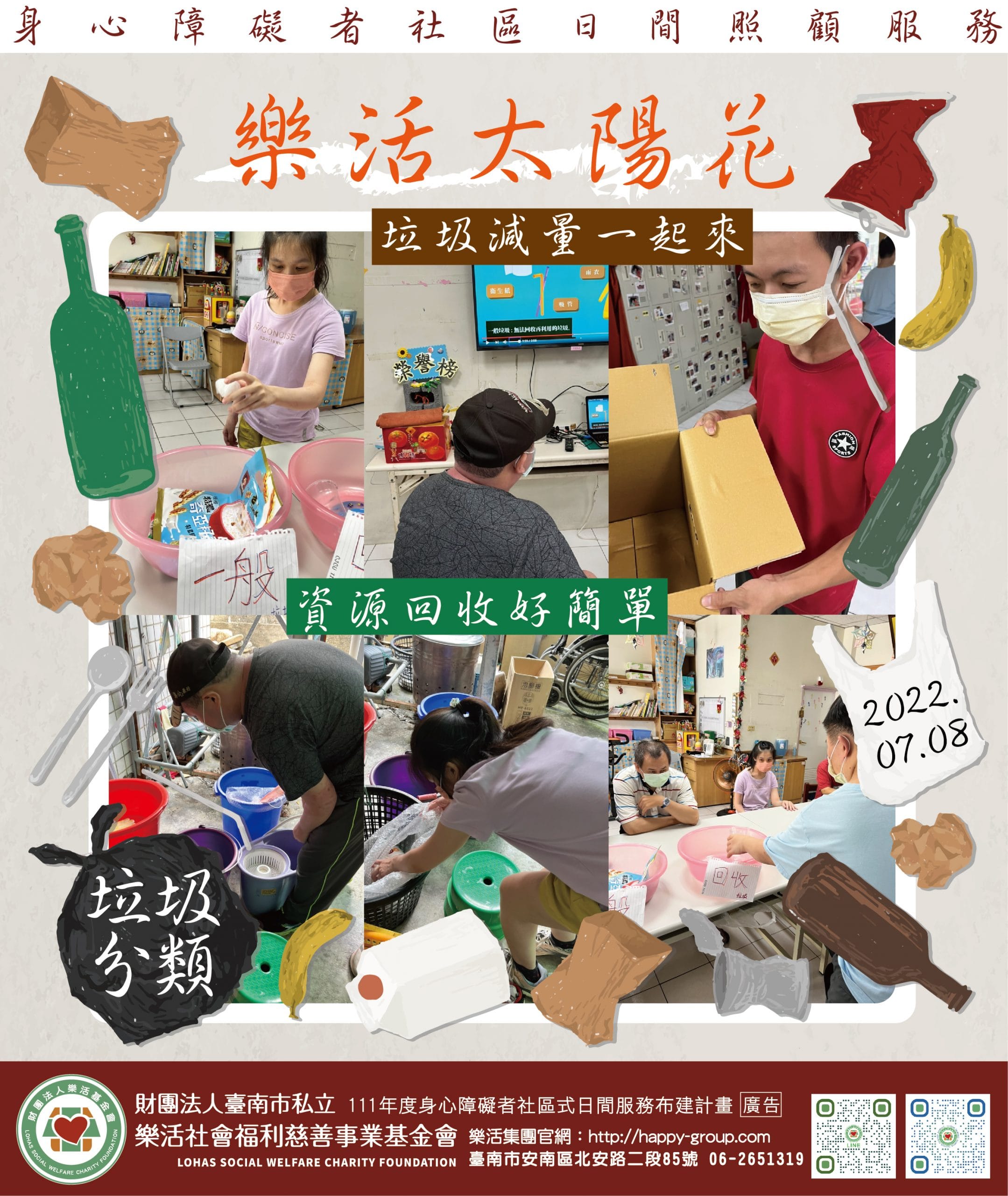 今日太陽花青年學習垃圾分類 從可回收的紙類、玻璃類、塑膠類、鐵鋁,搭配著實際體驗 讓我們一起當環保尖兵 垃圾減…