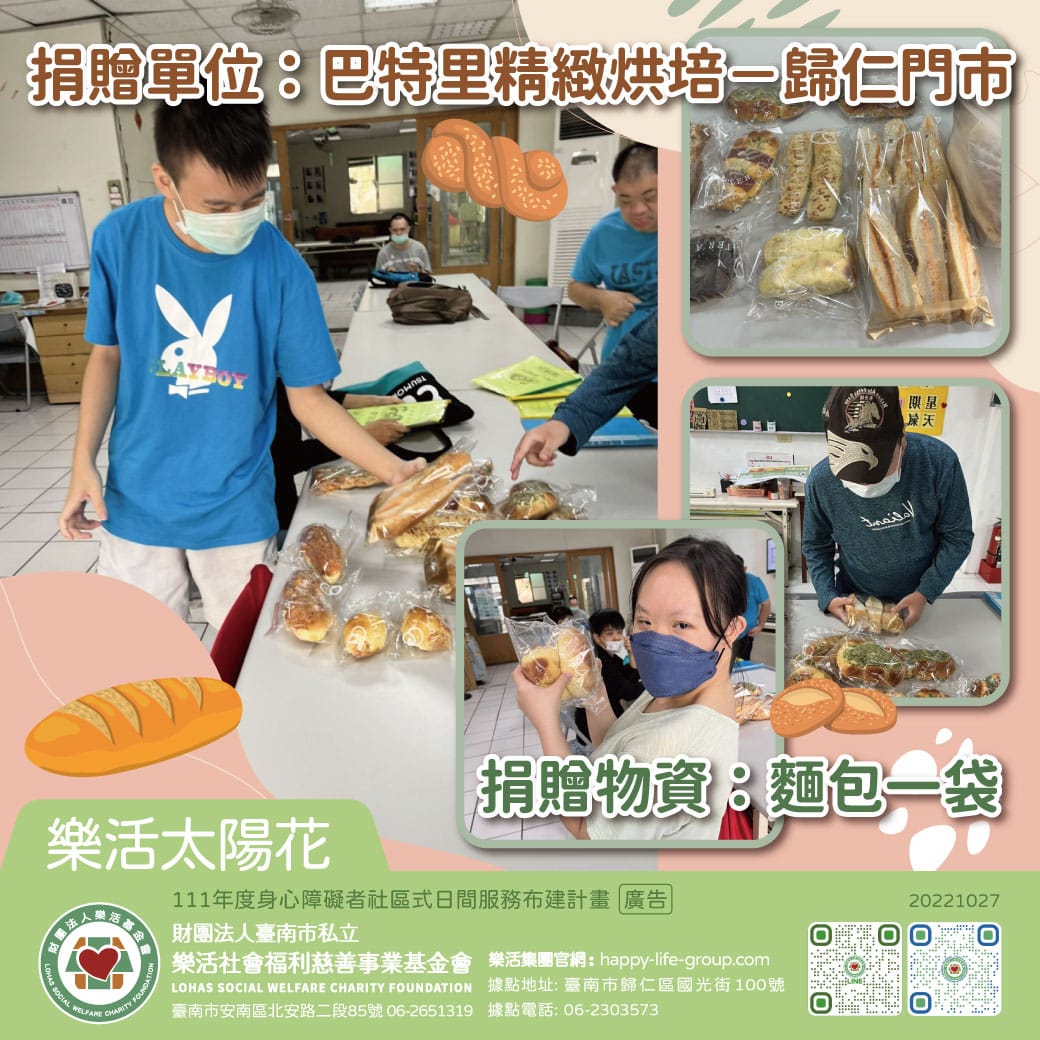 樂活太陽花巴特里麵包店-歸仁門市 今天太陽花收到巴特里精緻烘培歸仁門市滿滿的愛心 感謝巴特里麵包店分享那麼多好…
