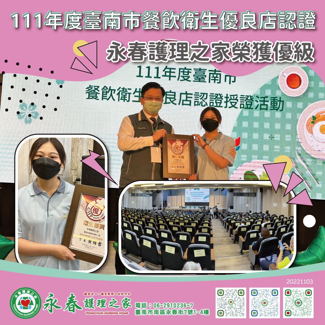 在全臺南市上千家餐飲店家的參選中,永春護理之家憑藉專業的營養計畫與高標準的飲食衛生安全,榮獲臺南市政府衛生局餐…