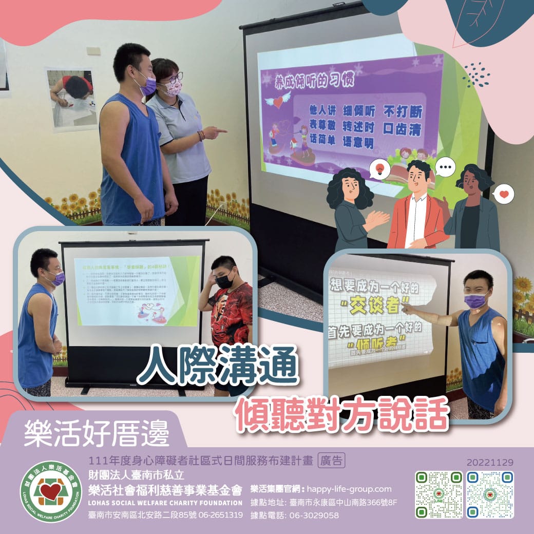 樂活好厝邊~持續招生中 人際溝通-傾聽對方說話 專注 避免批判 對方說出心裡感受時 我們可以同理對方 樂活好厝…