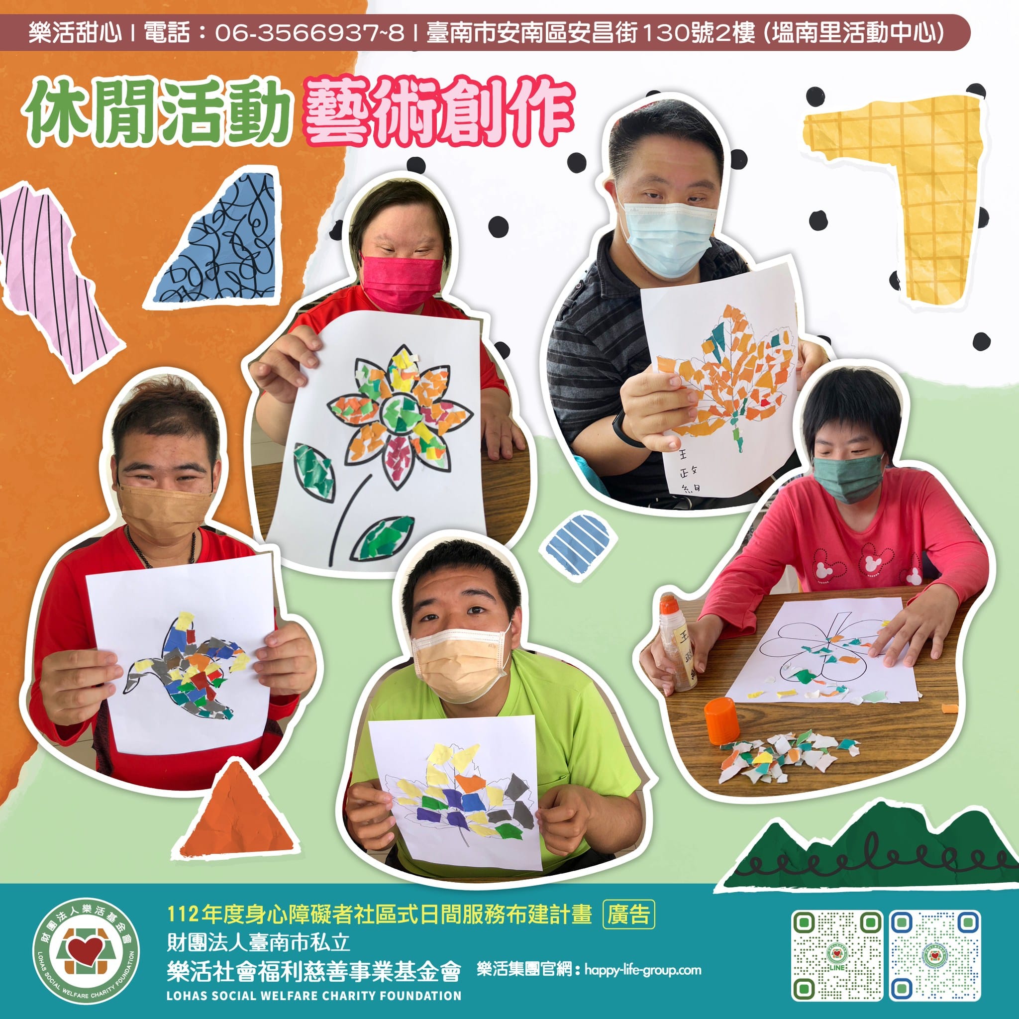 休閒活動-藝術創作 樂活甜心休閒活動-藝術創作今日帶領學員們製作拼貼畫,先將色紙撕碎,再挑選自己喜歡的顏色,貼…