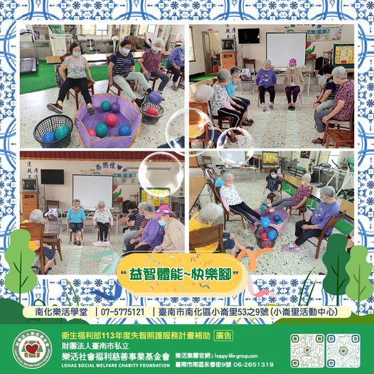 南化樂活學堂 【益智體能-快樂腳】 運用有趣的遊戲和競賽活動,讓長輩動起來,夾球比賽、坐姿百米跑,激發長輩求勝…