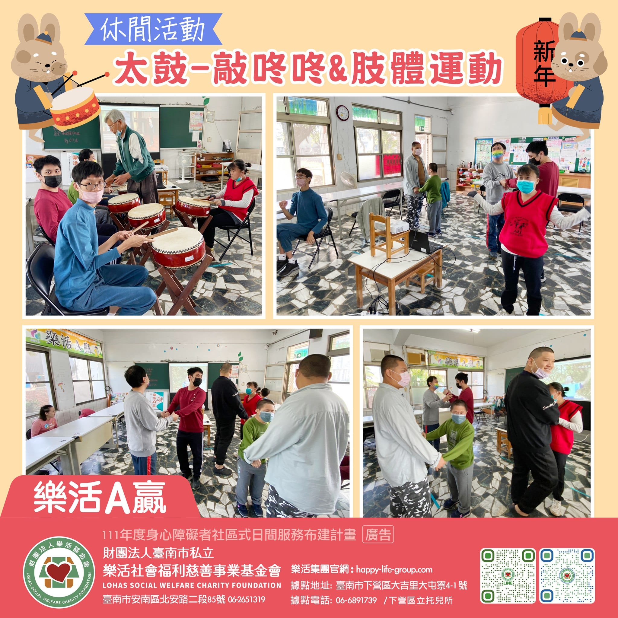 樂活A贏 咚咚..咚咚..咚咚…… 透過打太鼓讓智青們抒發壓力並增加信心及成就感 與舞…