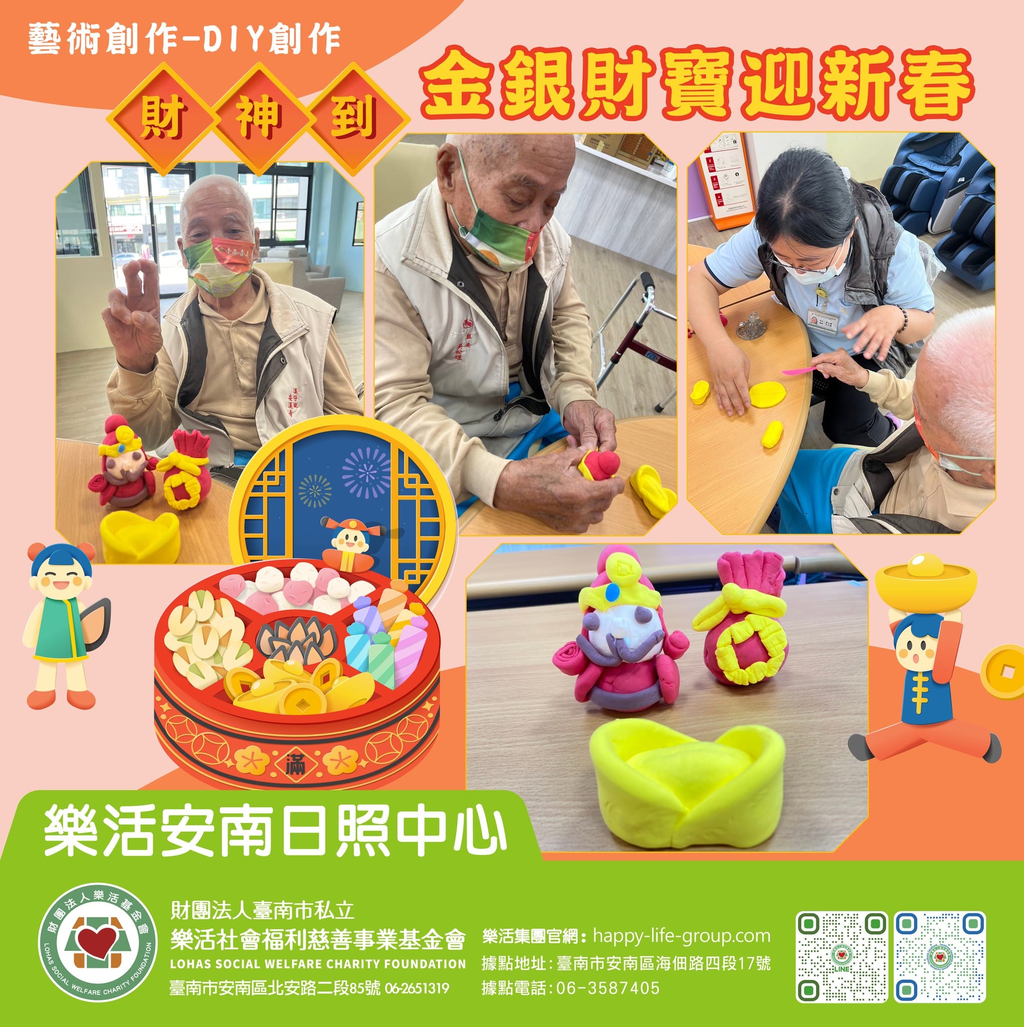 新年好 迎財神 金銀財寶迎進門 藝術創作-DIY手作 樂活安南日照的專業工作人員協助長輩完成 超級招財的金元寶…