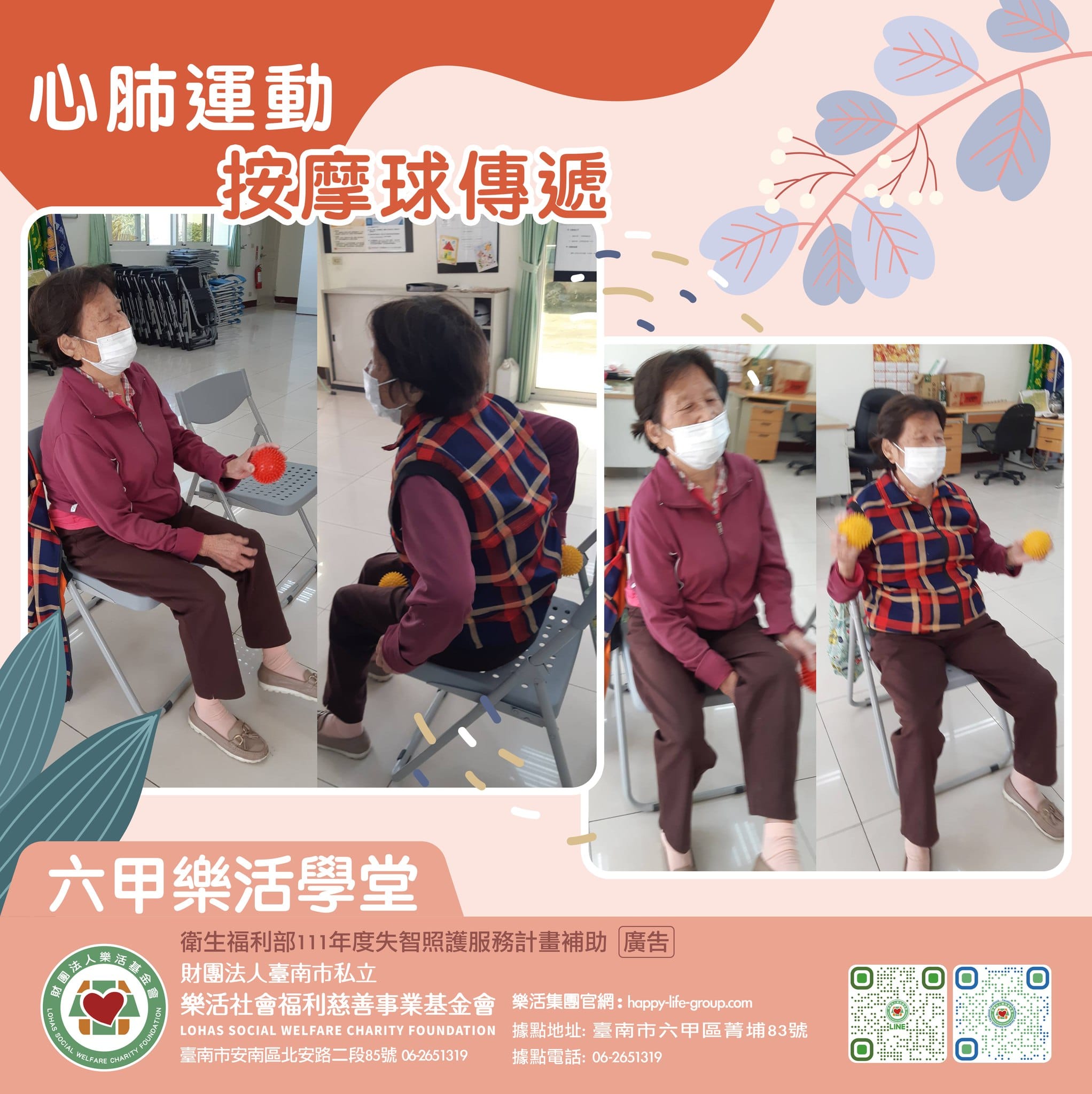 六甲樂活學堂 心肺運動(按摩球傳遞) 透過坐姿,上上下下‚左左右右傳遞球,增強長輩上肢及下肢肌耐力,身體柔軟度…