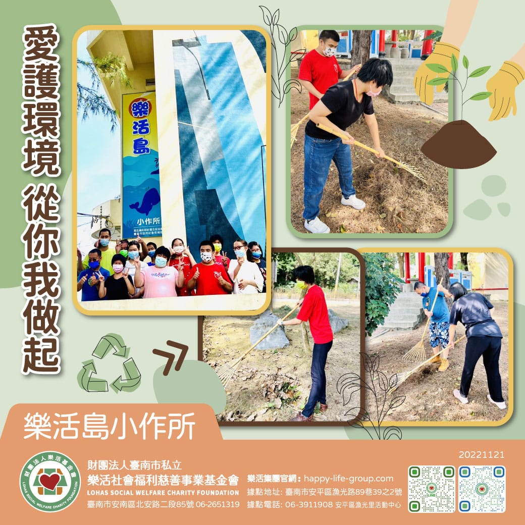 樂活島小作所 愛護環境 從你我做起 取之於社會用之於社會 平常智青運用社區豐富的資源 希望能為社區貢獻一份力量…