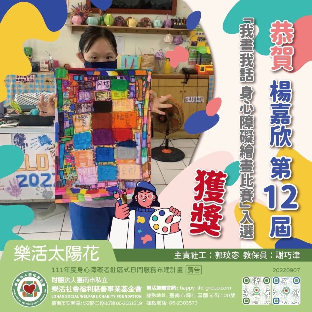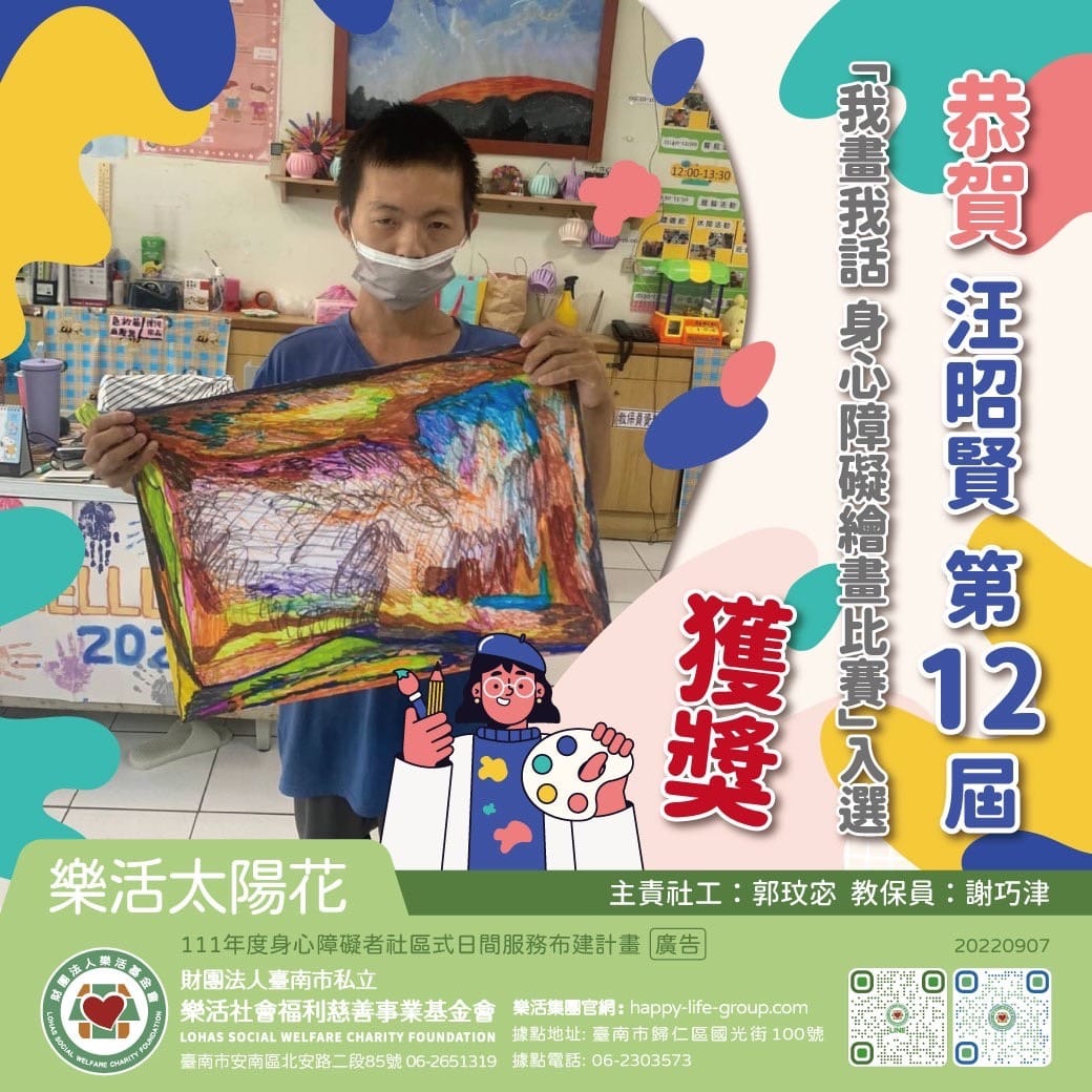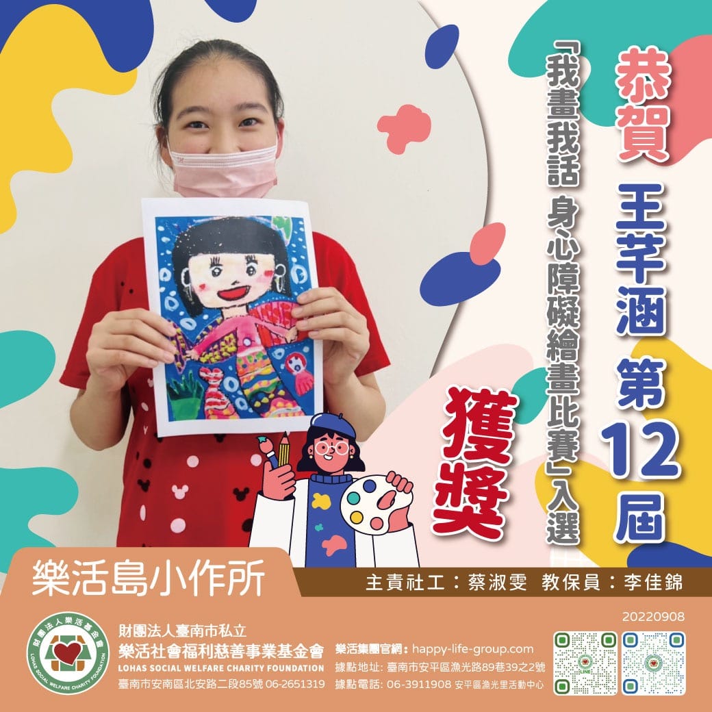 恭賀 樂活島小作所 王芊涵 參加 第十二屆「我畫我話」 身心障礙者繪畫比賽 獲獎 利用各種顏色畫出屬於自己的創…