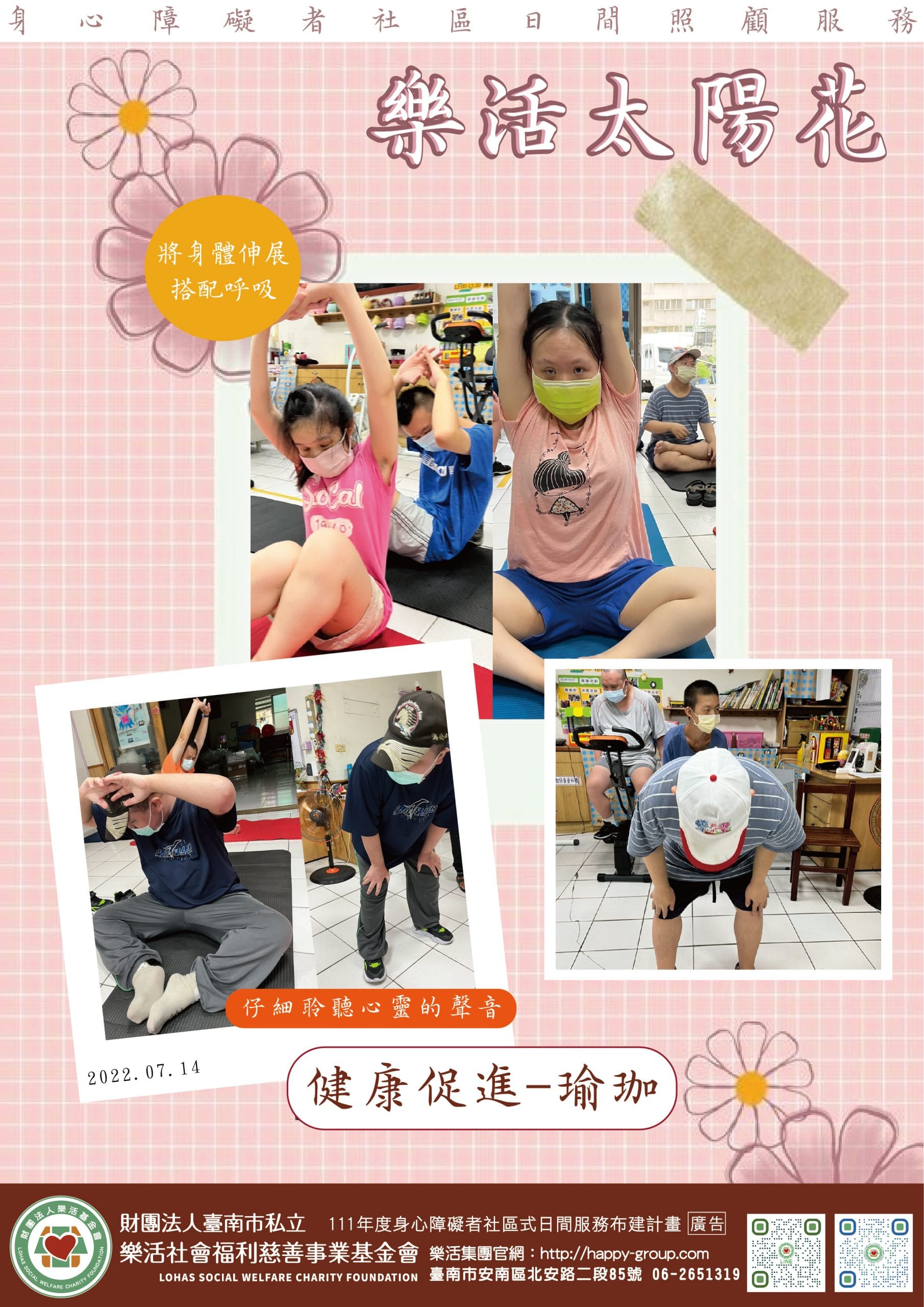 太陽花青年進行瑜珈前,先做暖身操, 預防運動傷害插腰畫圈、肩頸旋轉、蹲立跨步等動作皆難不倒青年們 接下來在瑜珈…