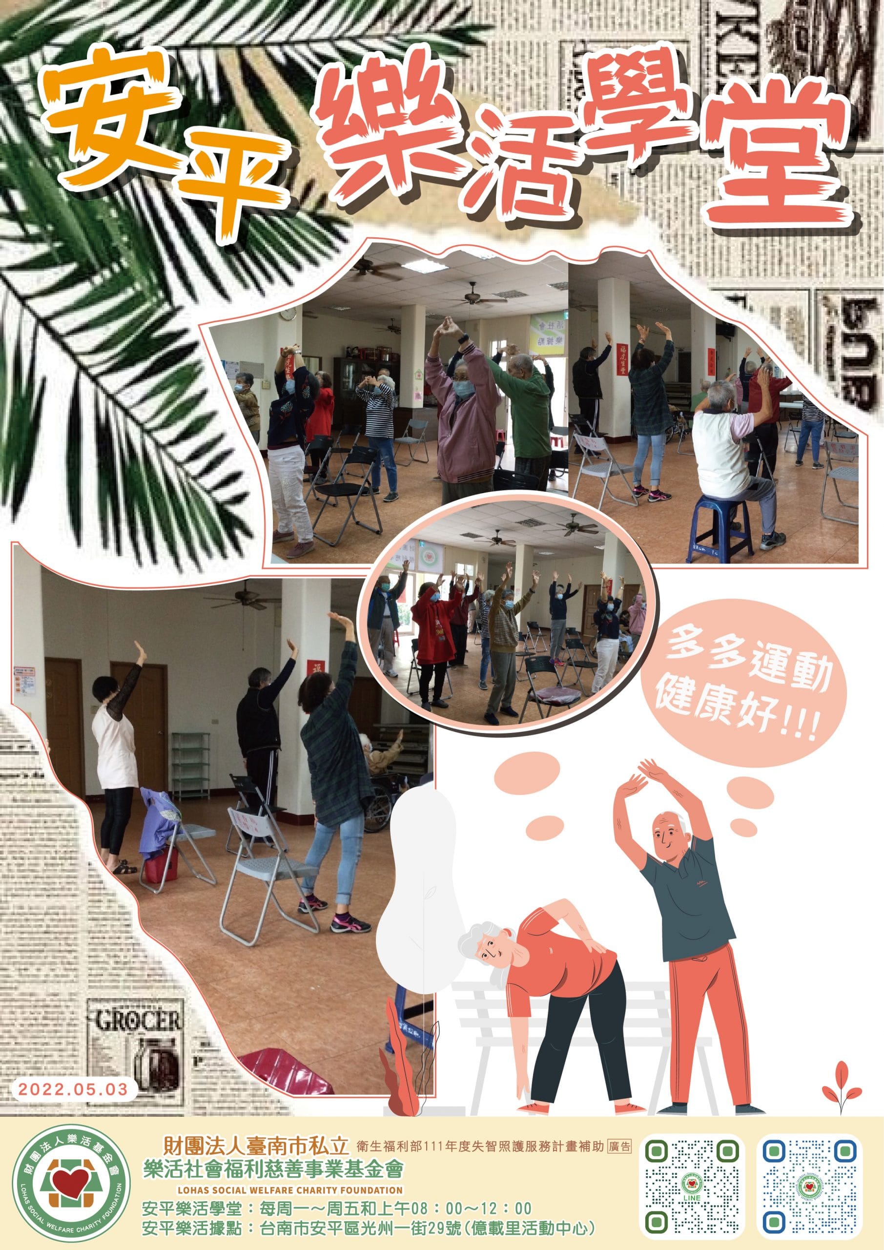 昨天放假一天今天帶領長輩做運動 活動筋骨雖然今天飄著毛毛細雨 但大家還是踴躍地參加 期待明天的活動 安平失智據…