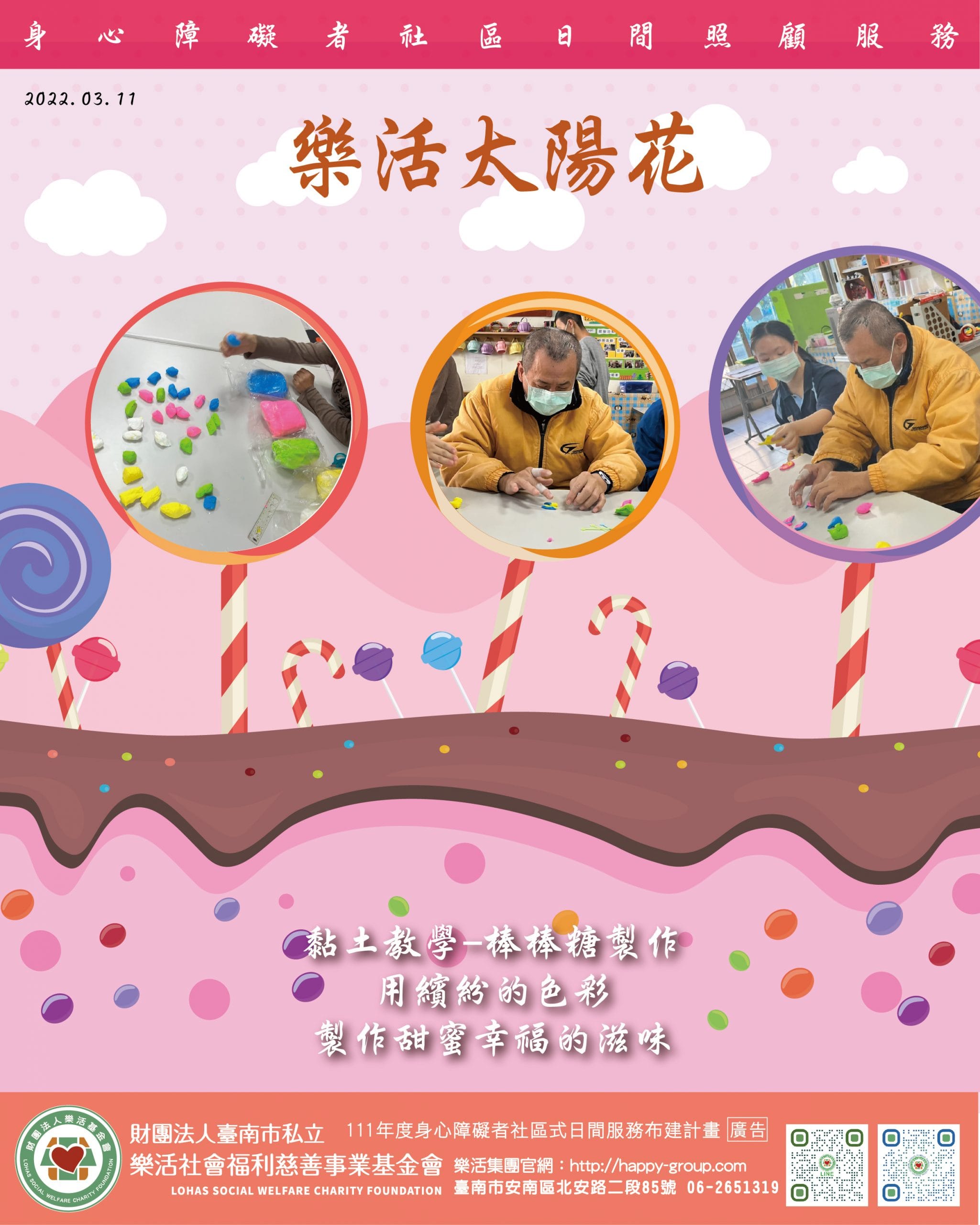 太陽花青年運用黏土繽紛的色彩製作甜蜜幸福的棒棒糖滋味過程中每個人都笑呵呵的氣氛融洽又溫馨在樂活太陽花只有歡樂與…