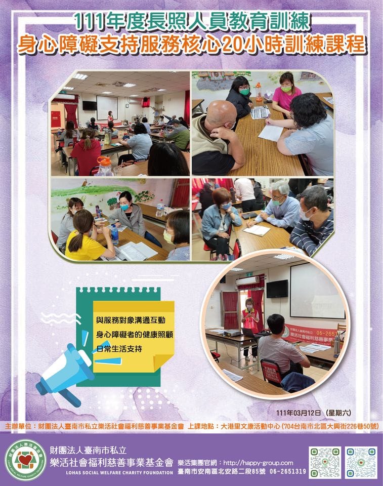 除了8大類的身障類別認識、還有如何與身障者相處及支持, 每一個細節都是提升我們的服務品質,歡迎關注我們的FB了…