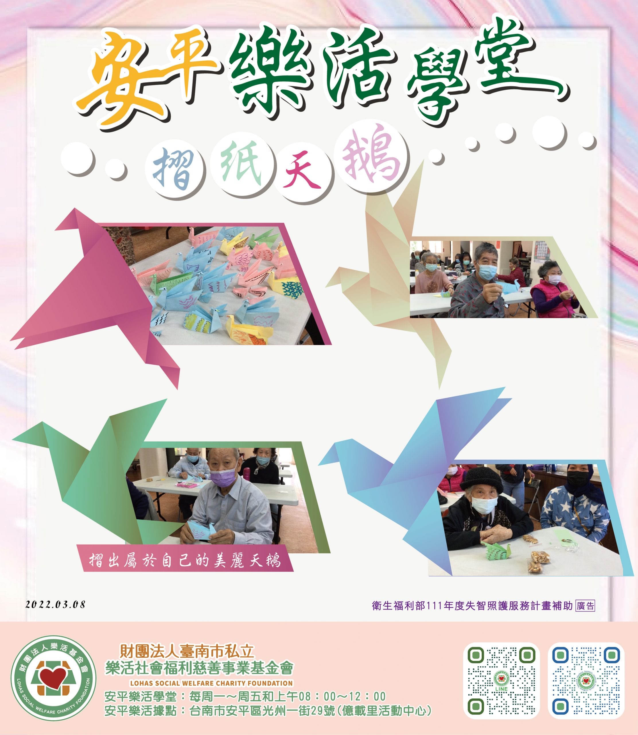 安平樂活學堂的億群好朋友 今天大家挑戰來摺紙鶴 五彩繽紛的紙鶴 不疾不徐慢慢的摺 每一隻都是大家辛苦的傑作 期…