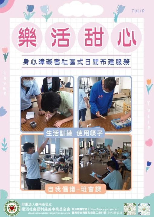 自我倡議鼓勵夥伴們提出自己的意見,一起讓樂活甜心可以更加美好 今日生活訓練帶領大家使用筷子,樂活甜心的專業人員…