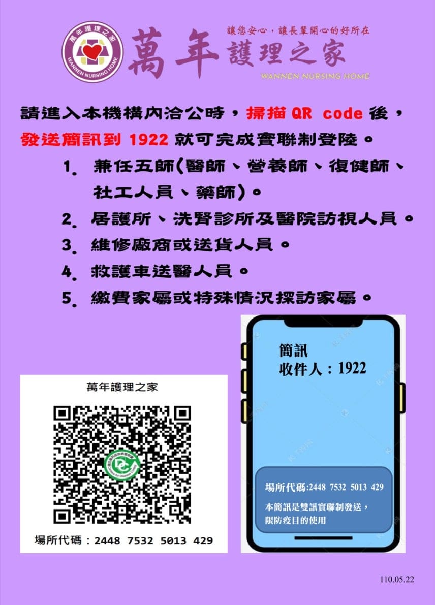 【萬年護理之家】防疫一起 GO~ UncategorizedBy happylifegroup28 5 月, 2021防疫一起~愛升級 勤洗手 戴口罩 簡訊實聯制~ 請下列人員入內洽公時,掃描本護家QR code後,發送簡訊到1…