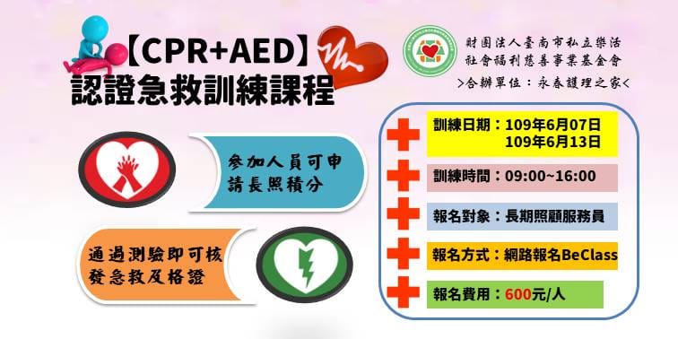 【基金會】109年心肺復甦和電擊術(CPR+AED)培訓課程 基金會活動資訊及訓練課程, 活動訊息By happylifegroup1 6 月, 2020109年心肺復甦和電擊術(CPR+AED)培訓課程 👀培訓目的:為增進全民急救技能,進而透過訓練將相關急救技能…