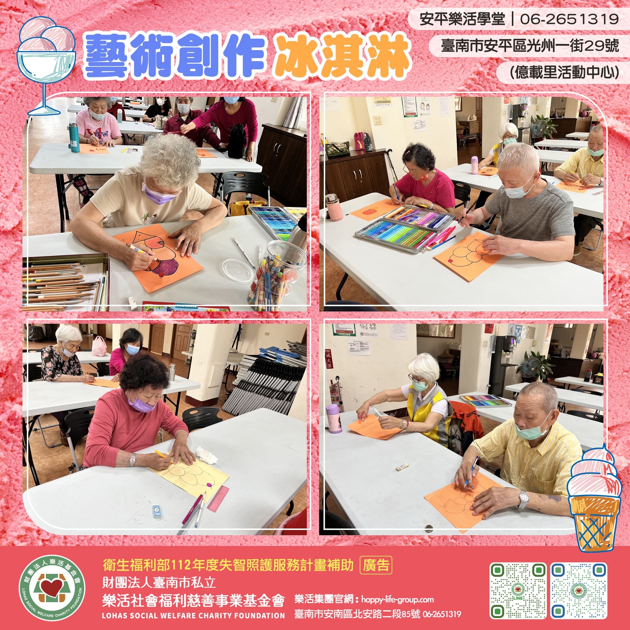 安平樂活學堂【藝術創作-冰淇淋】為了增加長輩們的認知不再只是著色現在自己還要加入描邊讓作品更佳的獨特鼓勵長輩能…