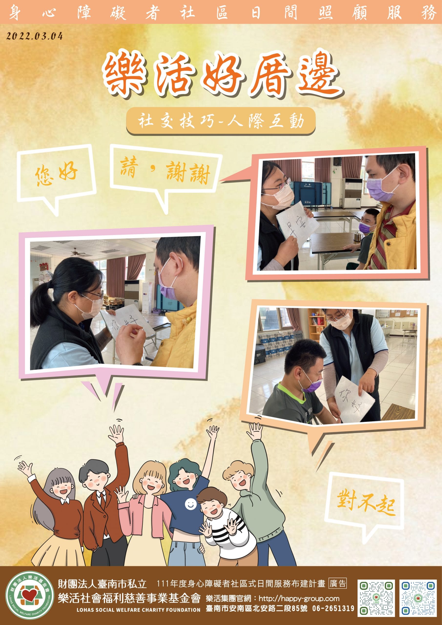 一起來說請、謝謝、對不起 夥伴們開心而且專注的練習 人際互動的禮儀由我們做起 貼心的服務持續的學習快樂的成長好…