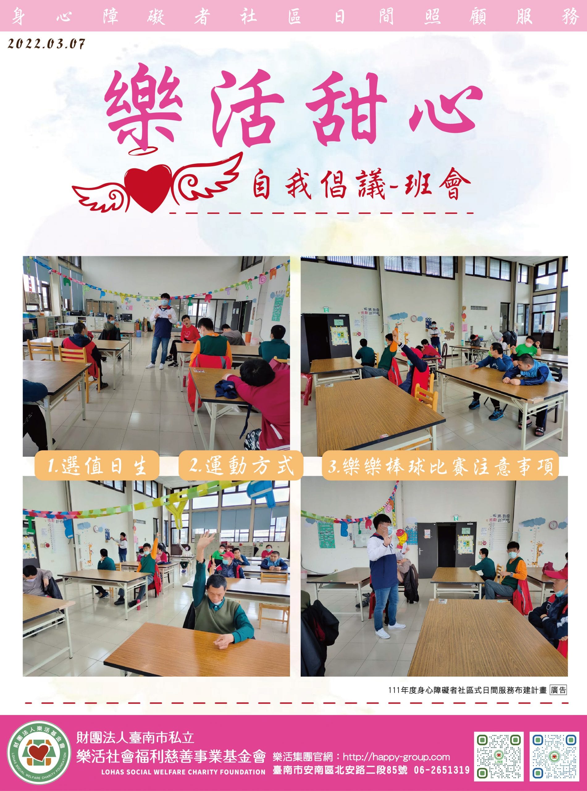 今天天氣突然就變得寒冷起來, 但夥伴們仍是準時抵達樂活甜心, 今天的自我倡議班會, 大家都選出了值日生及運動項…