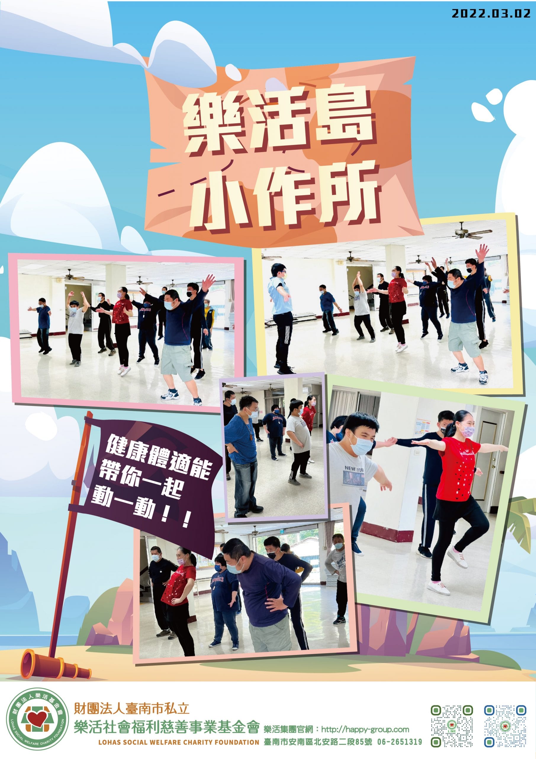 開合跳、深蹲、練平衡 體適能大家都很有活力活動筋骨 扭腰、拉筋、十指交扣往上拉 訓練大家柔軟度 樂活島智青用行…