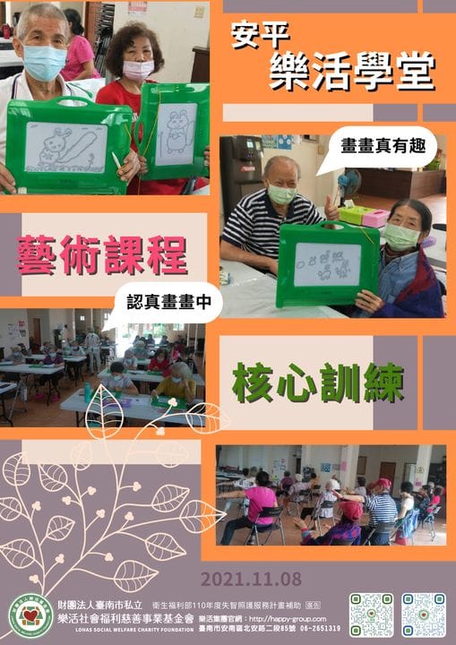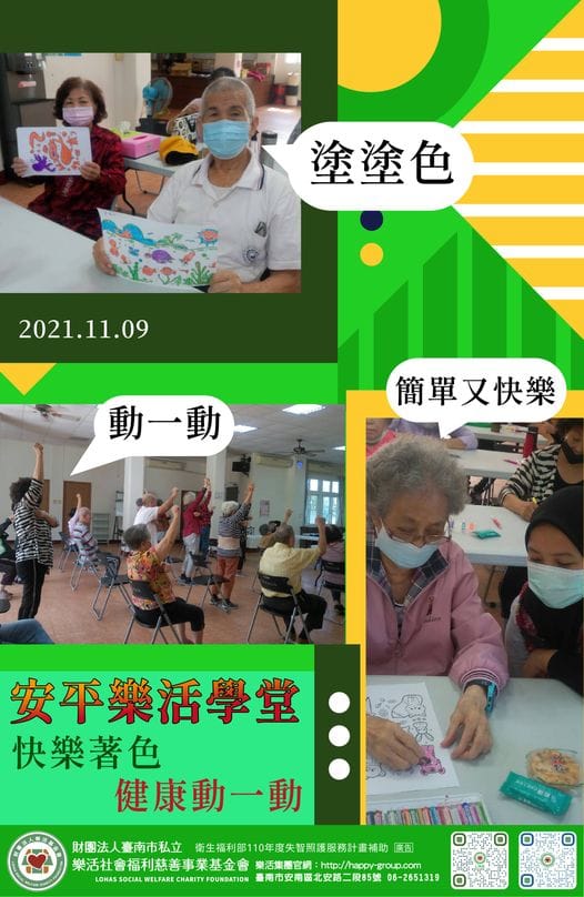 安平樂活學堂的億群好朋友 藝術課程-畫畫課 雖然是一樣的圖 但透過大家的創意著色 每一張都是獨一無二 運動-核…