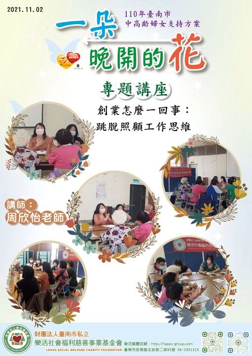 中高齡婦女支持系列講座 專題講座開跑囉 第場 主題:創業怎麼一回事:跳脫照顧工作思維 透過老師的分享 打破了許…