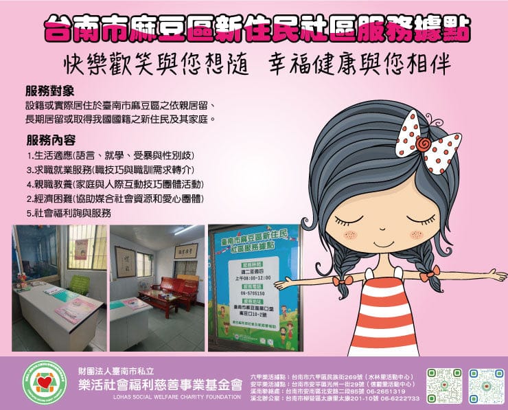 【快樂歡笑與您相隨 幸福健康與您相伴】 您好嗎?樂活基金會關心您!針對遠嫁來台灣的新住民給予適時關懷協助與求知…