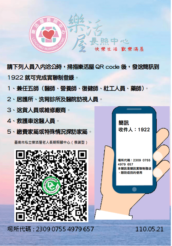 【樂活屋】簡訊實聯制~ 活動花絮, 活動資訊By happylifegroup4 6 月, 2021守護健康防疫疫起來勤洗手 戴口罩 簡訊實聯制~請下列人員入內洽公時,掃描本機構QR code後,發送簡訊到19…