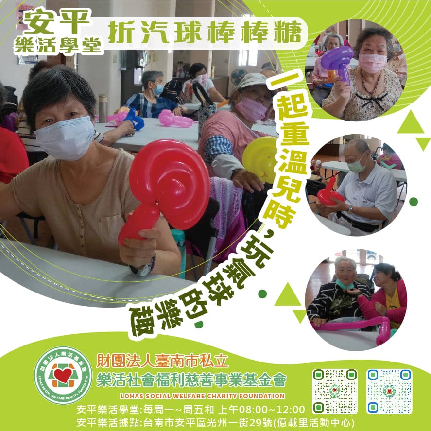 安平樂活學堂玩氣球 樂活爺奶一看到氣球有點嚇到 害怕氣球容易爆破 跟著氣球達人的教學示範折一個棒棒糖 捏捏 轉…