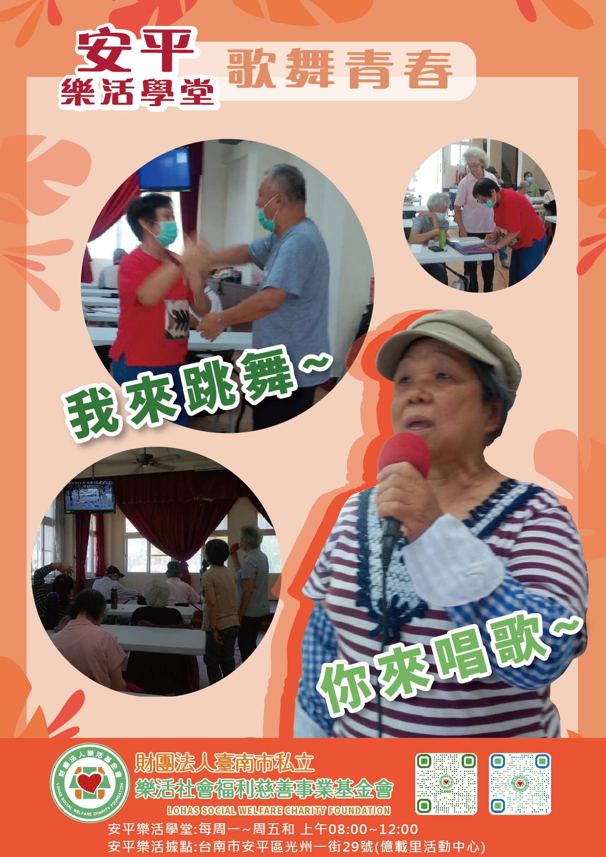 安平樂活學堂歌舞青春 先練個緩和伸展操脊椎放鬆擺動手臂活化腰椎 手如波浪鼓般隨著身體轉動可助按摩內臟 喝個水唱…