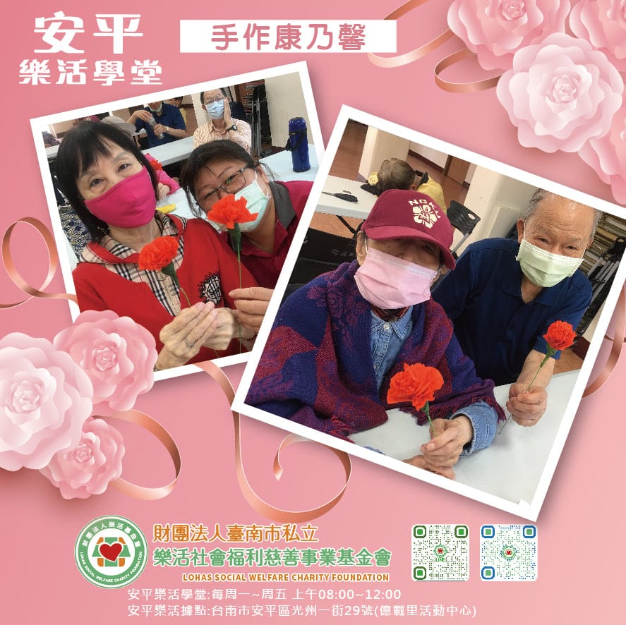 安平樂活學堂今天這麼玩 手作母親卡 一張粉色卡紙對摺又對摺 用上花邊剪刀 把感謝與祝福的話寫在花朵裏 一朵神奇…