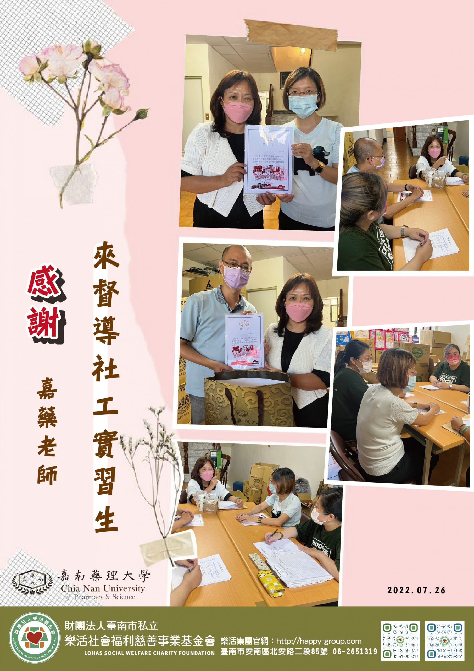 嘉藥李麗雲老師視察督導,特地頒發感謝狀給基金會彭雅芬執行長及林郁勝督導,感謝樂活基金會的協助讓嘉藥學生可以在基…
