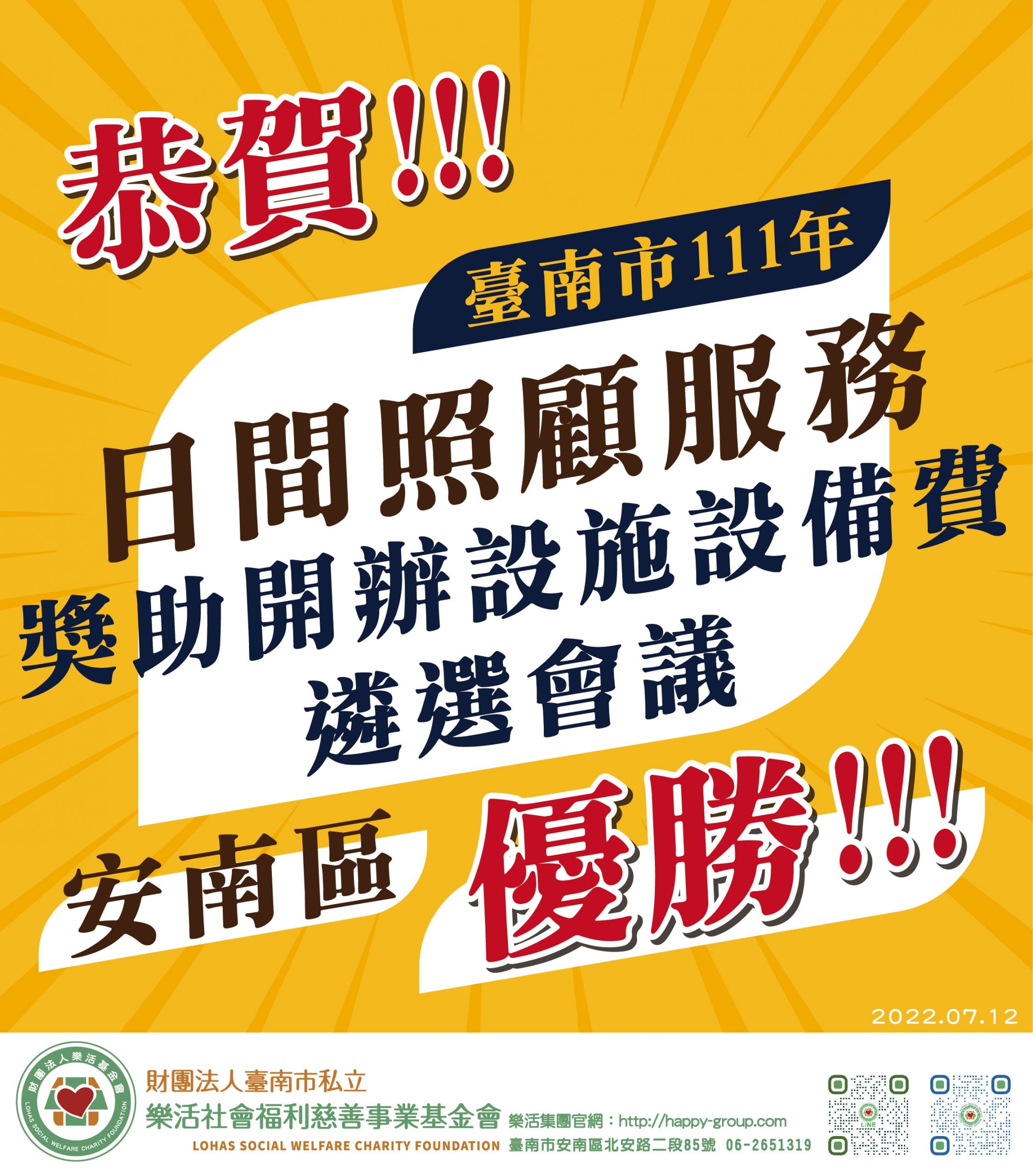 恭賀!!!!!!!!!!【日間照顧服務獎助開辦設施設備費遴選會議】 安南區-優勝!!!!!!!!!!