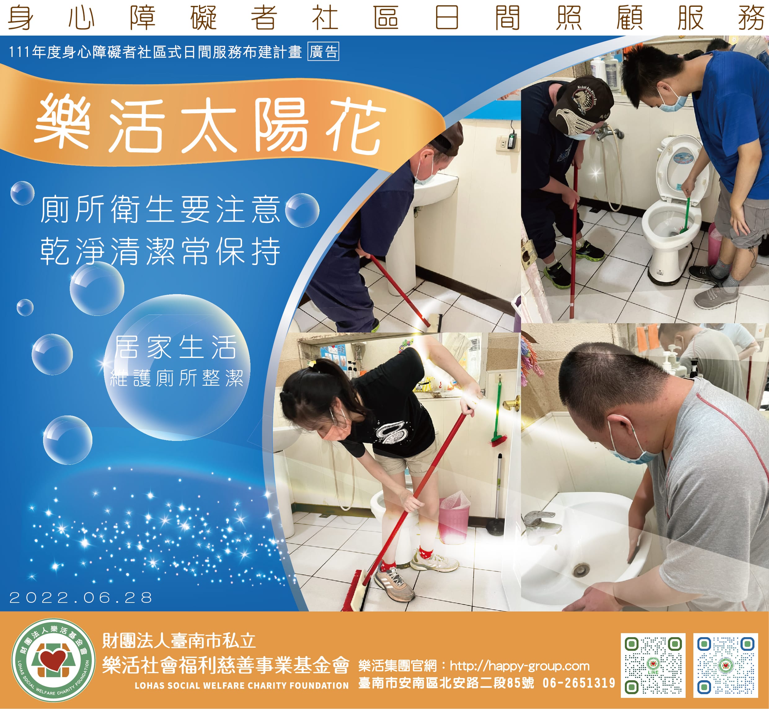 今日太陽花青年配合昨天的如廁禮儀,學習如何維護廁所整潔。 一開始青年們先將廁所沖濕、配合著清潔用品一起將地板上…