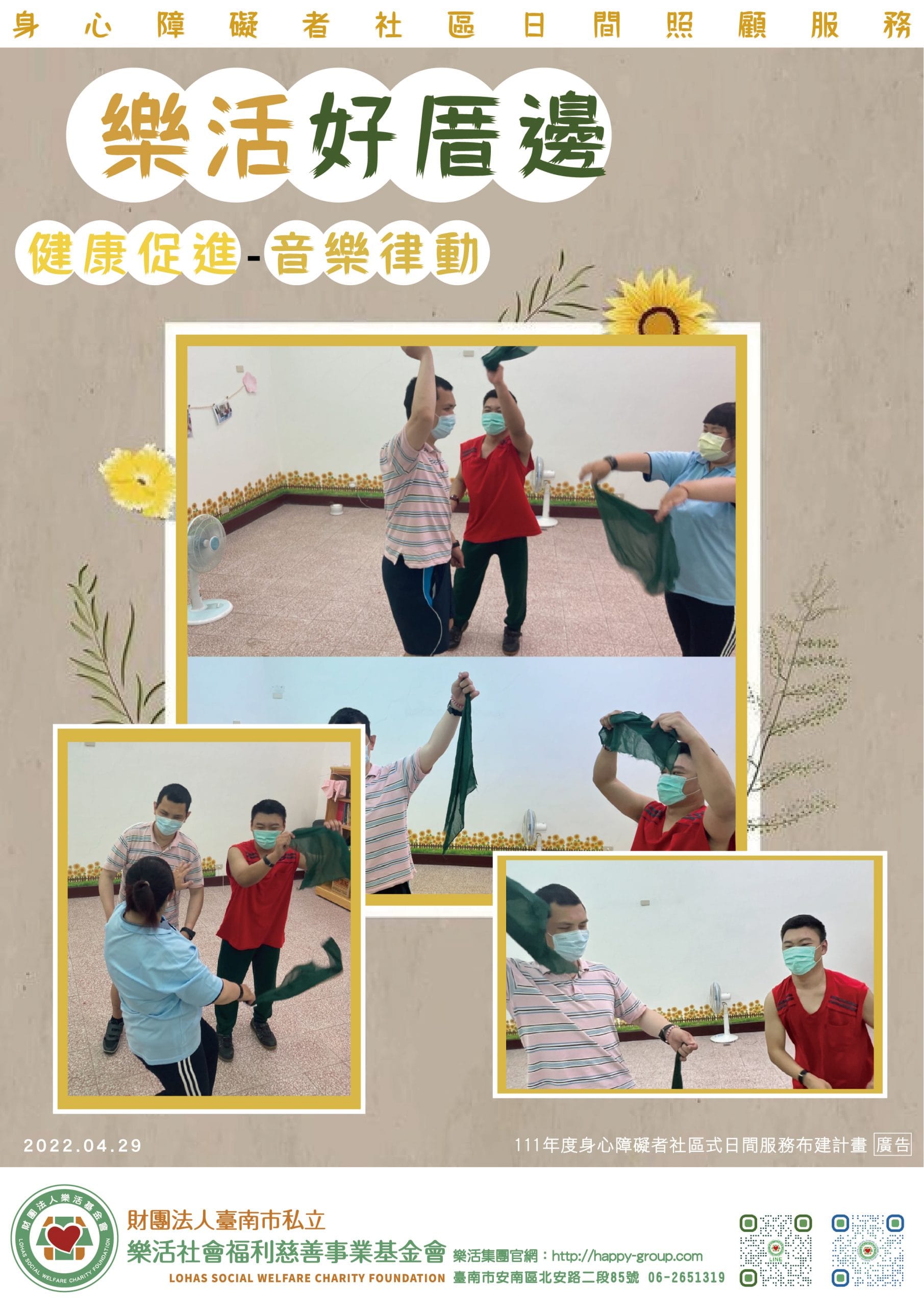 跟著音樂Happy 律動、健身、手腕運動 揮動絲巾練習捏著物品來扭轉手腕 貼心的服務 持續的學習 快樂的成長 …
