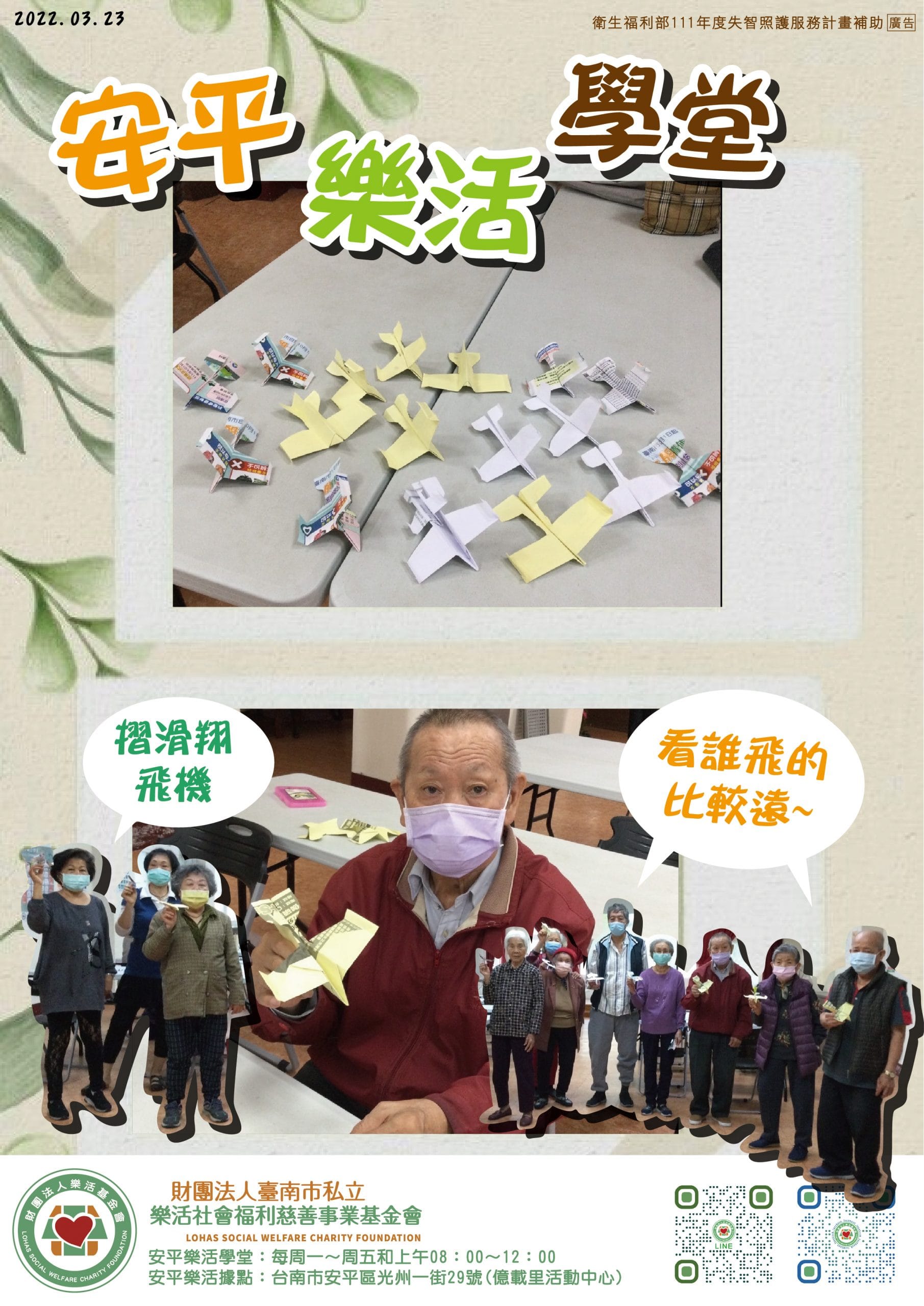 安平樂活學堂的億群好朋友 今天來嘗試摺滑翔飛機 大家一起排排站來比賽 看誰飛得比較遠 期待明天的活動 安平失智…