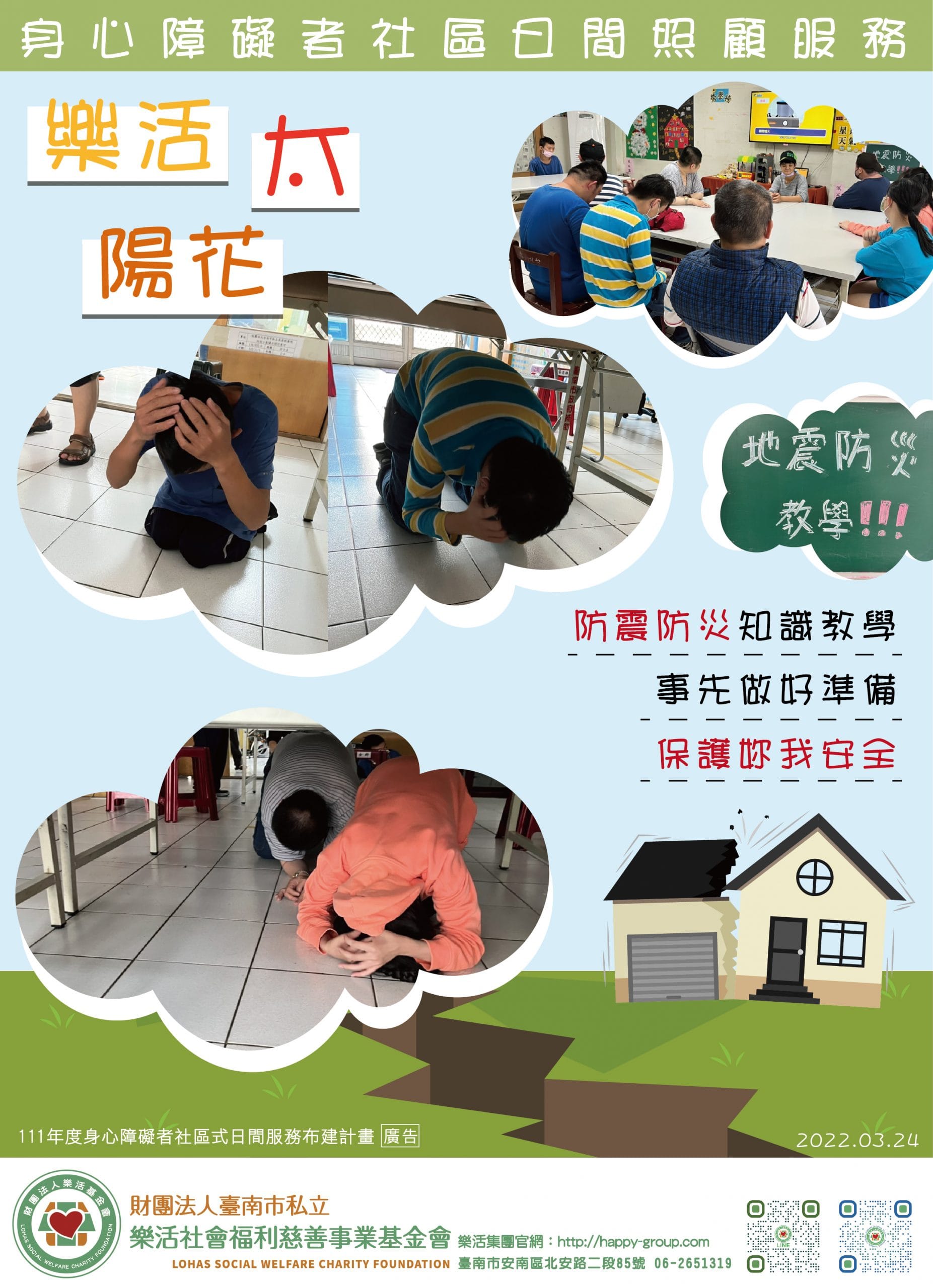 太陽花青年學習地震防震知識以預防地震來襲時, 可以冷靜應對任何狀況遵守 地震掩護三步驟:趴下、掩護、穩住 並在…