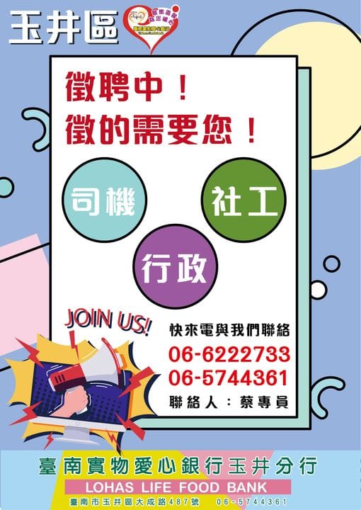 徵聘中!!!!!!徵的就是您!!!臺南愛心實物銀行-玉井分行【司機】【社工】【行政】快來電聯絡我們呦~~~