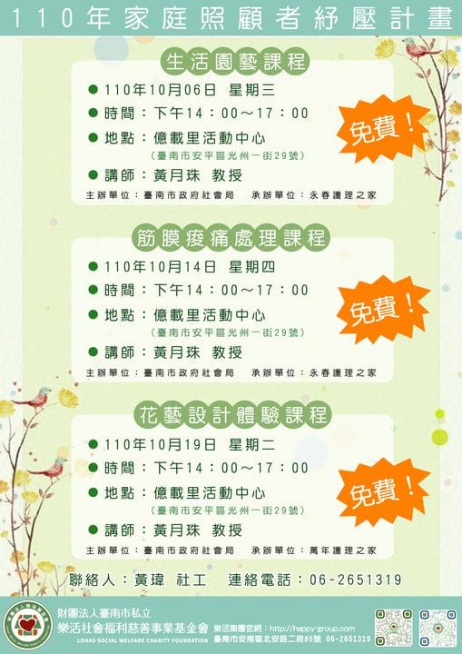 【臺南市家庭照顧者紓壓系列活動計畫】三連發