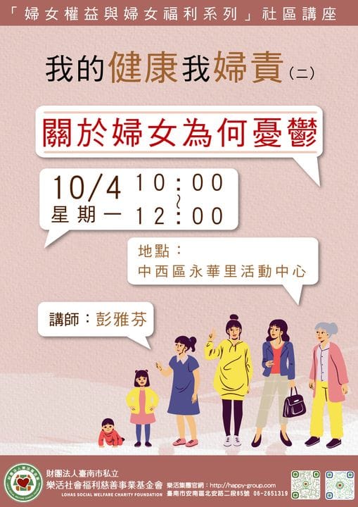 10/4(一) 10:00-12:00 我的健康我婦責-關於婦女為何憂鬱地點:中西區永華里活動中心 (臺南市中…