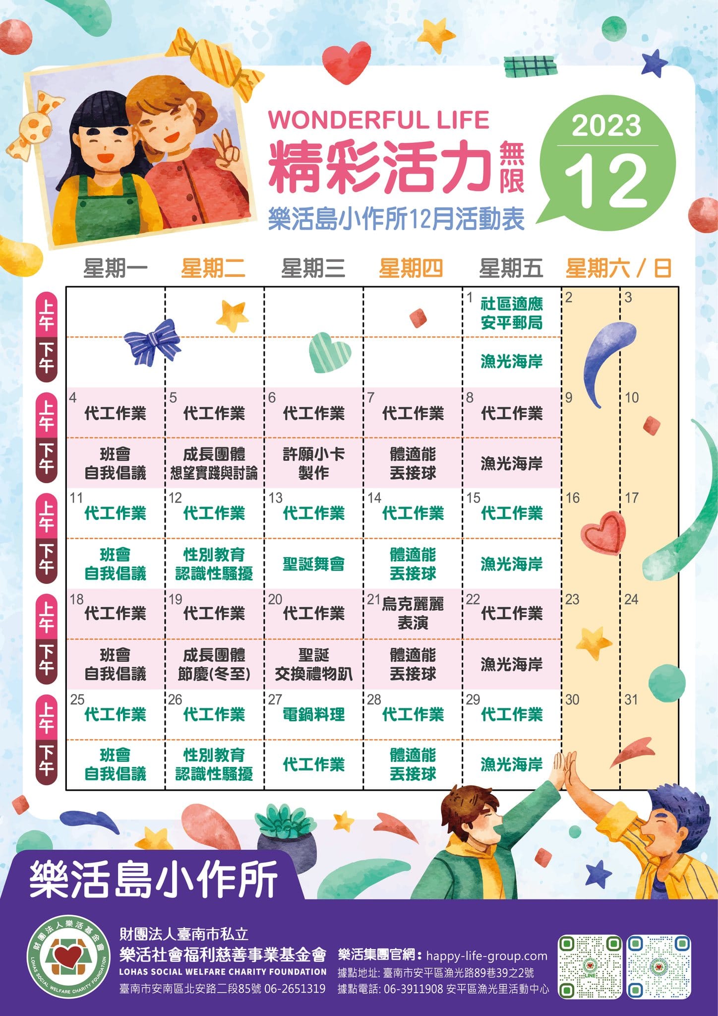 樂活島小作所 熱呼呼的12月份活動表出爐囉 代工作業休閒活動社區適應 體適能活動班會活動樂活小廚房 聖誕節活動…