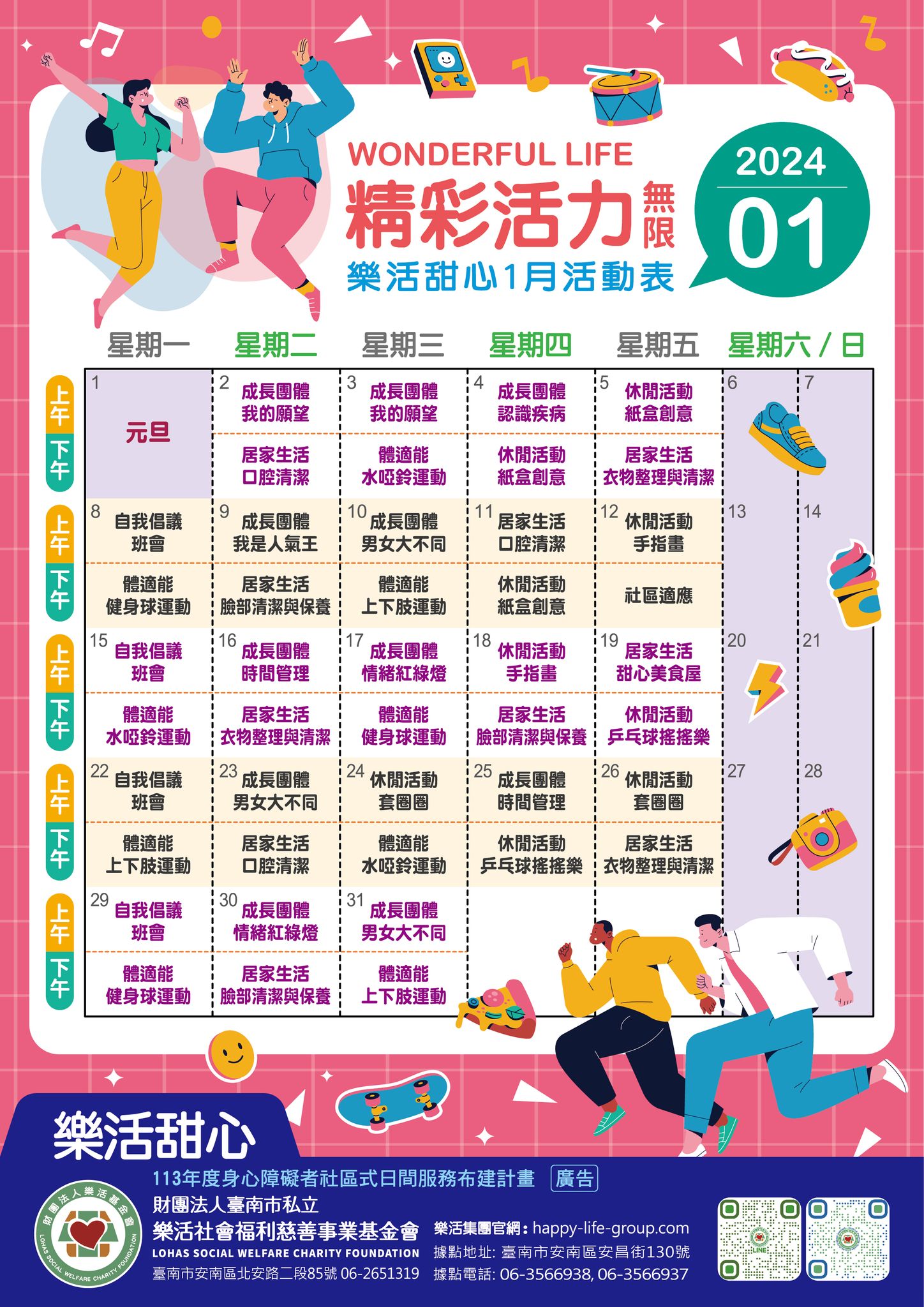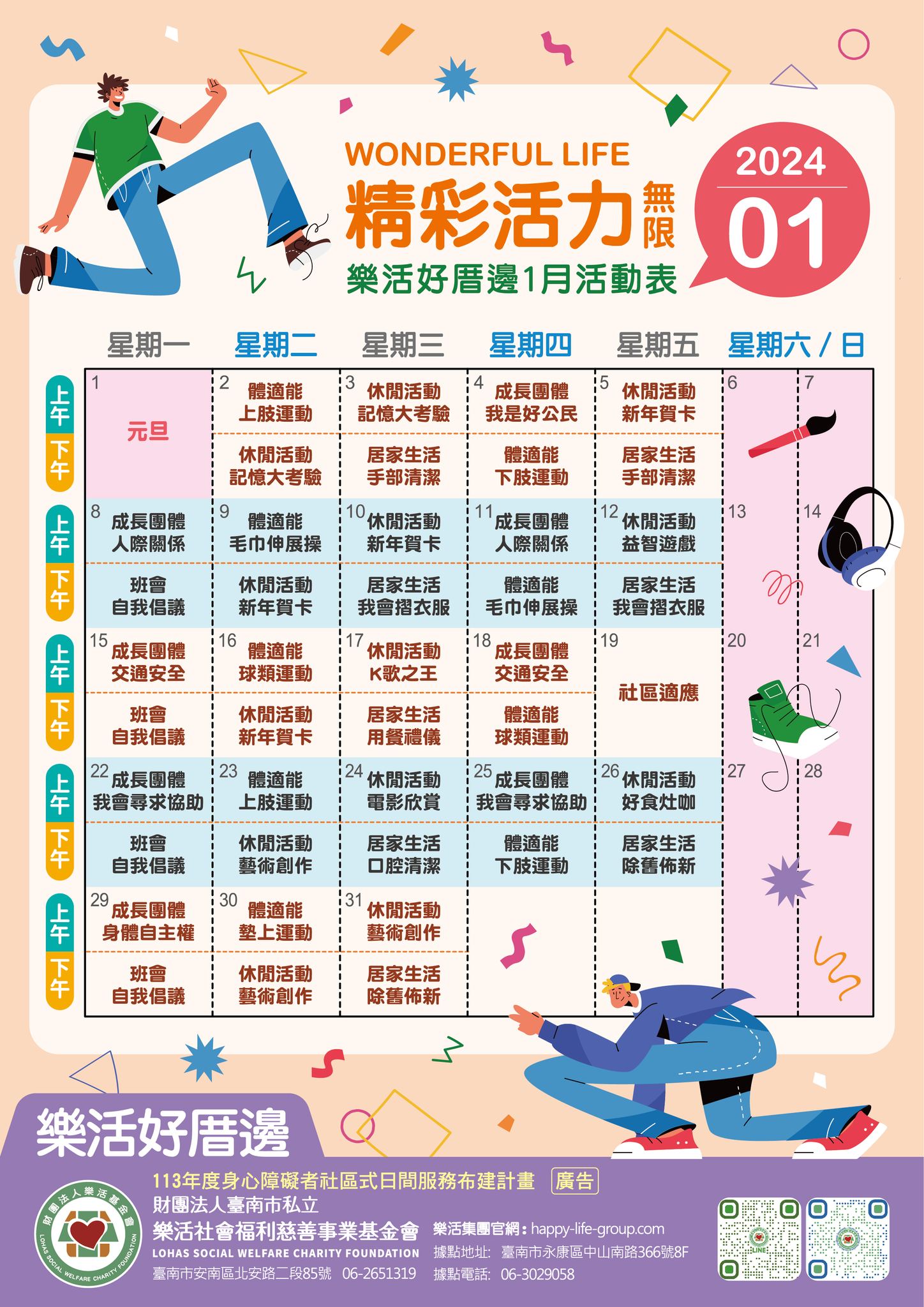 樂活好厝邊 ~熱烈招生中 充滿新氣象的2024~1月份活動表出爐囉 休閒活動社區適應 體適能活動班會活動好食灶…