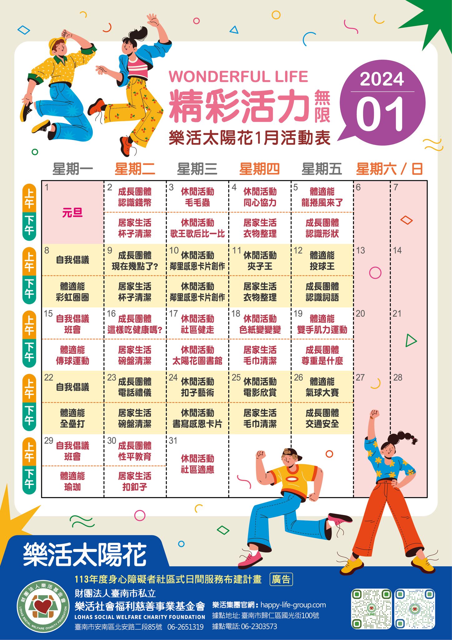 樂活太陽花 1月份活動表 2024年的第一個的月來囉 太陽花青年一起向大家說聲 HAPPY NEW YEAR …