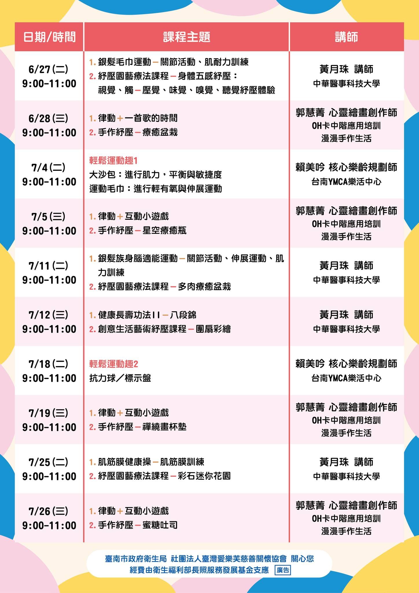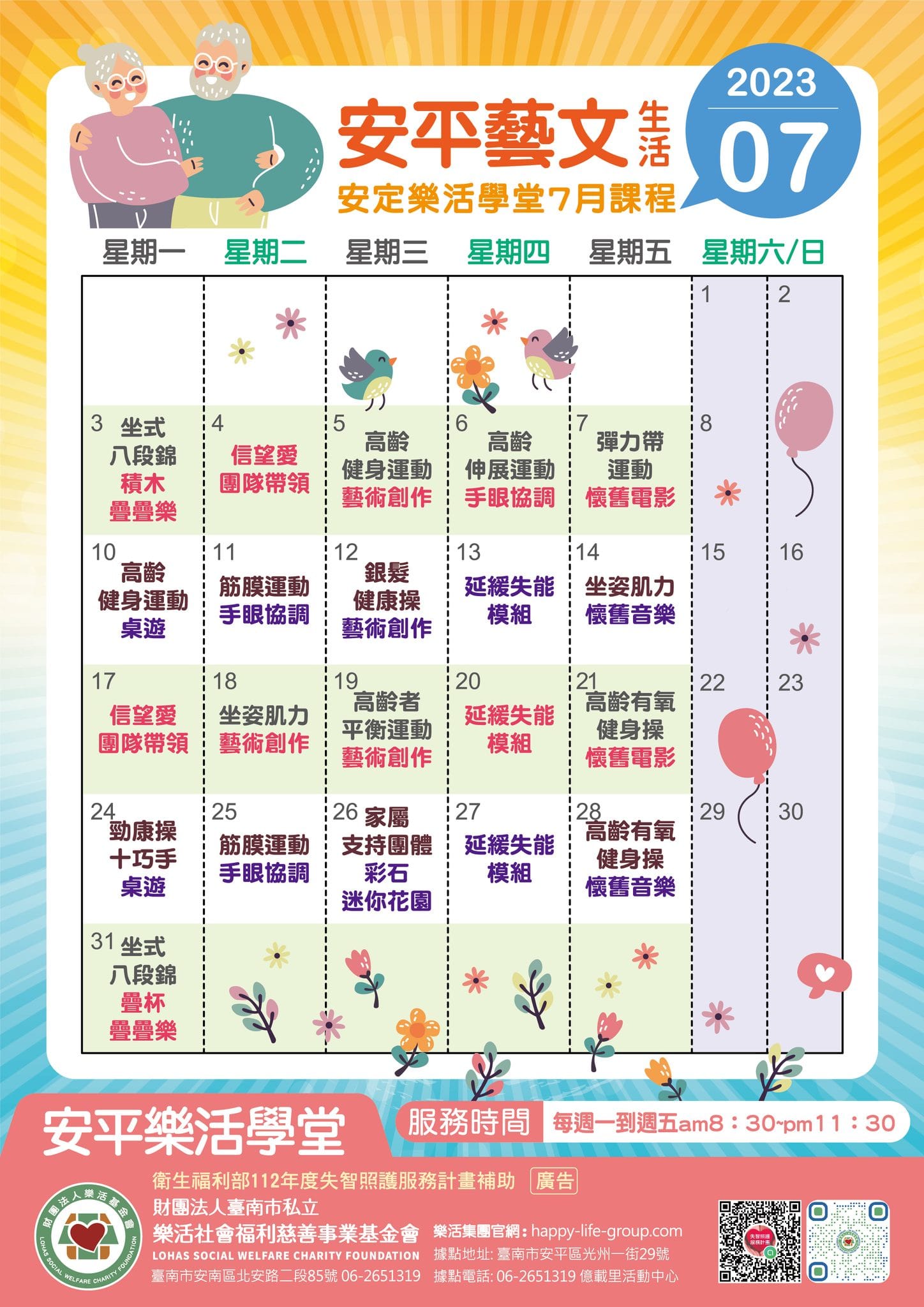 安平樂活學堂 七月份的課程出爐囉 運動健身 藝術創作 音樂治療 認知活動 懷舊系列 信望愛團隊的活動帶領 延緩…